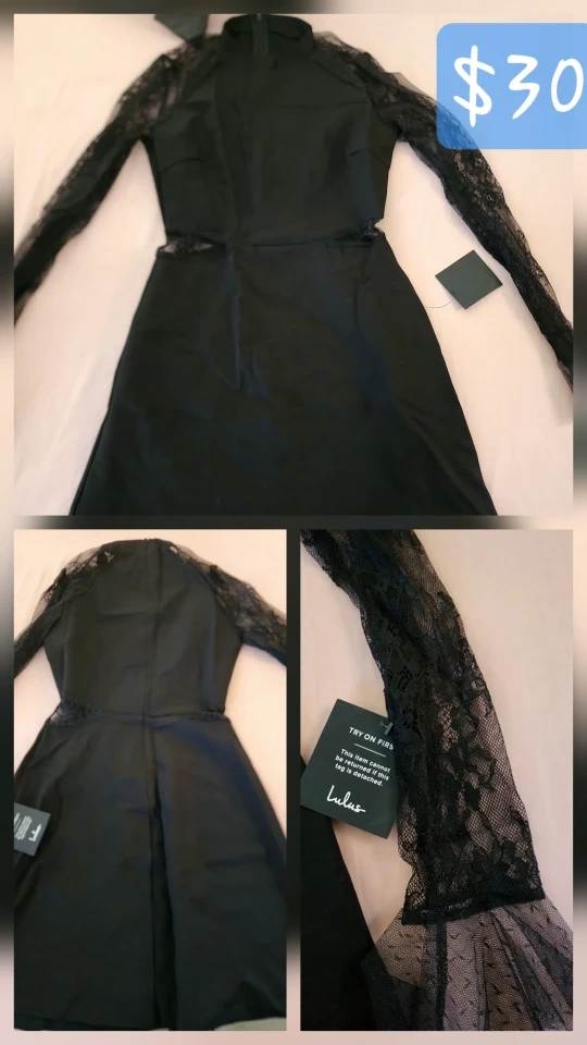 60Selling a cute black Lulus dress with lace sleeves! It's in great condition and ready for a new home. It was originally $30.