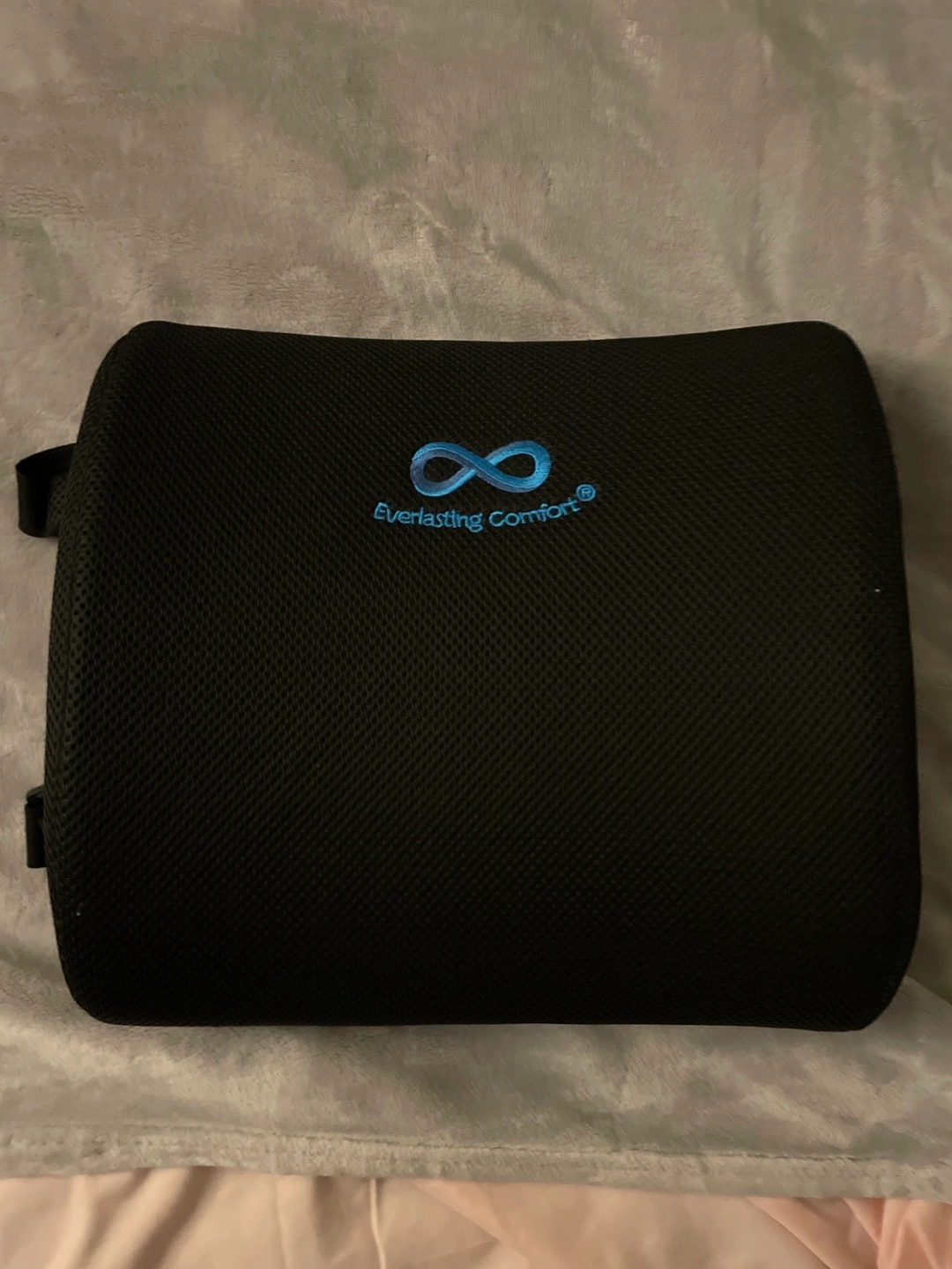 475Black lumbar support cushion. Mesh fabric. Adjustable straps. Excellent for car seats or office chairs. Provides back support.
