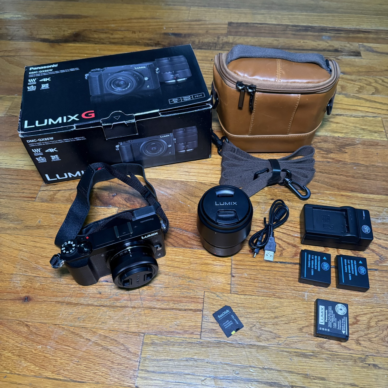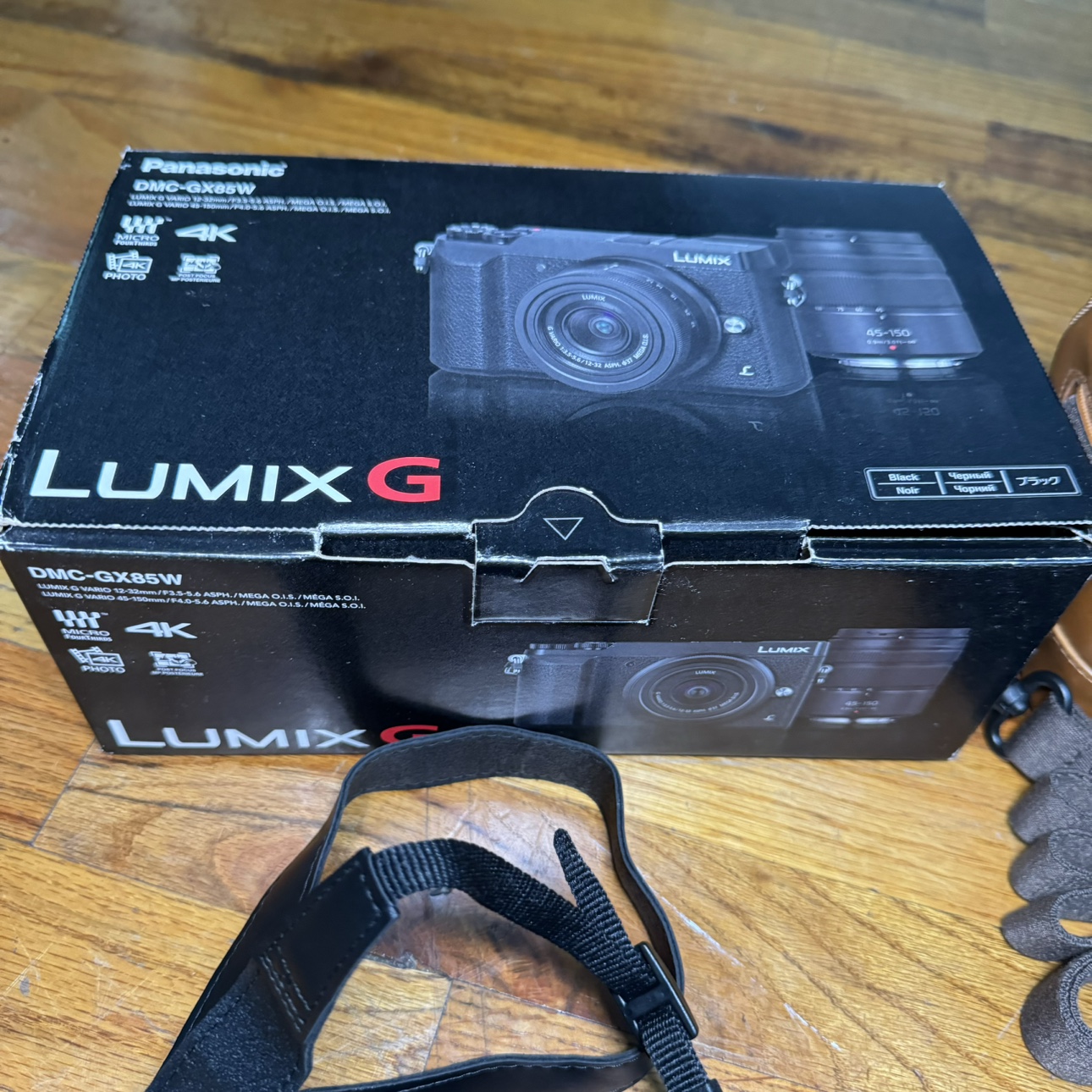 25Panasonic Mirrorless LUMIX GX85 4K Digital Camera, 12-32mm and 45-150mm Lens, 32gb memory card & Bag Best for filming and personal vlog Comes with: Camera Two lenses Three batteries and charger Charging cable 32 GB card Leather carry bag Original box user manual and all other accessories Ask me any question Yes, price negotiable