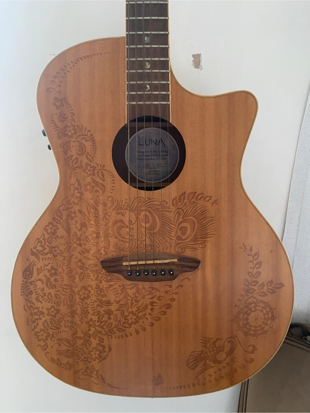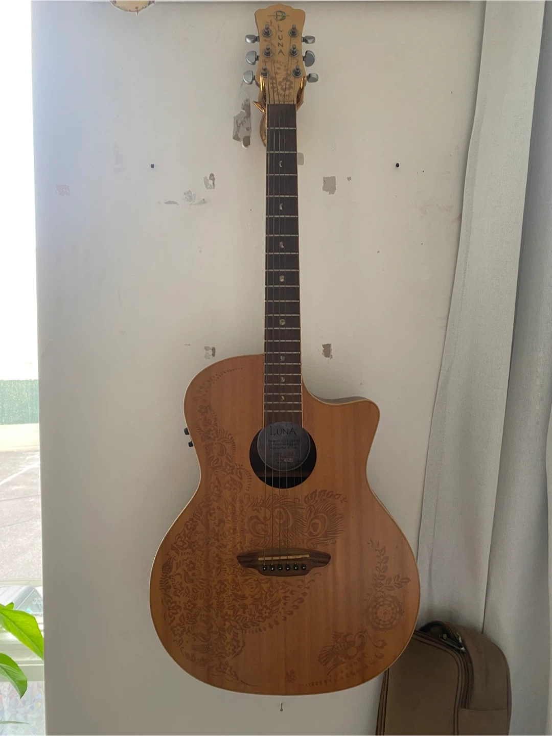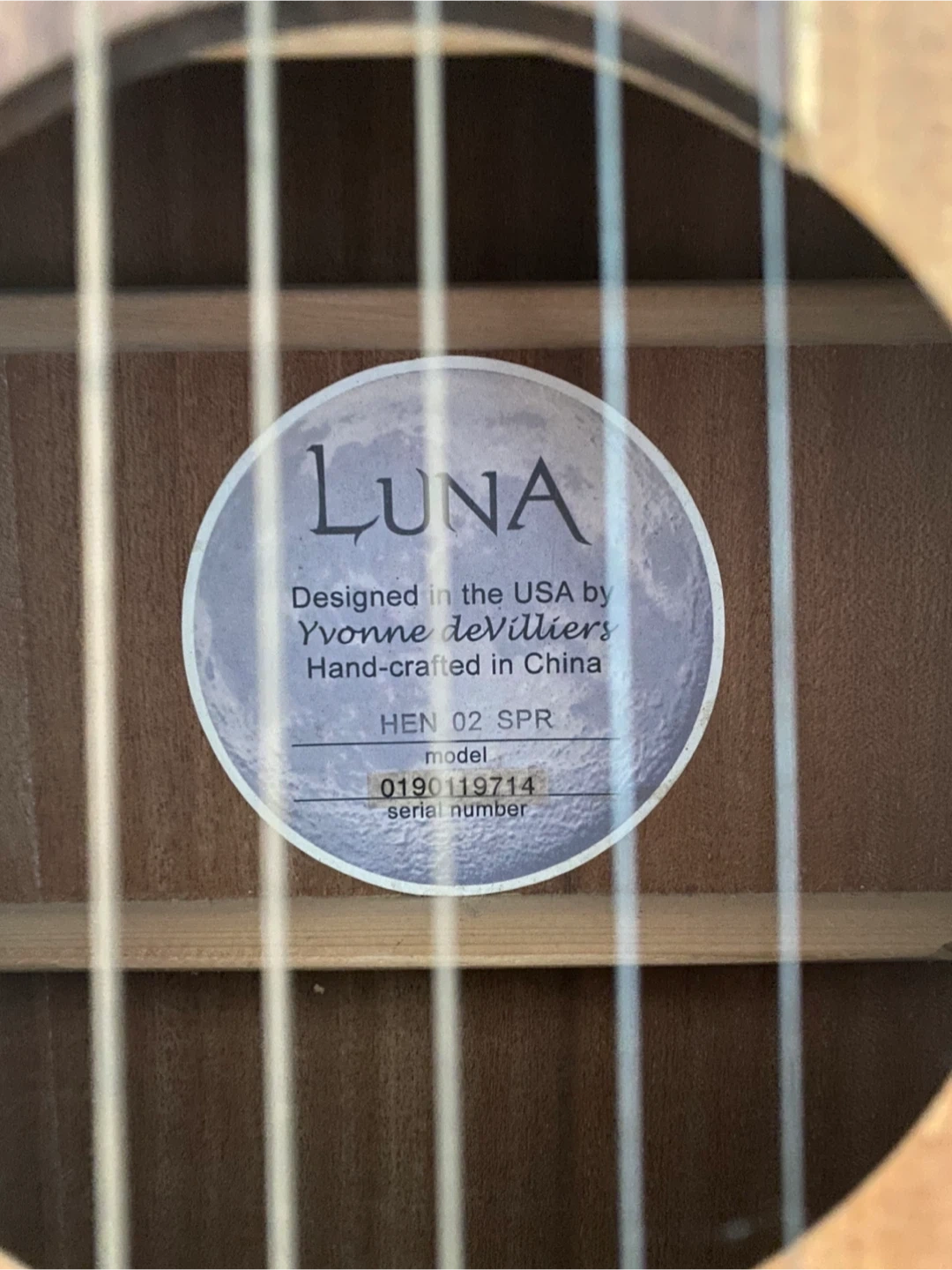 65MOVING SALE! Selling a Luna HEN 02 SPR acoustic guitar! It's in mint condition and comes with a Taylor Guitars gig bag for transport.