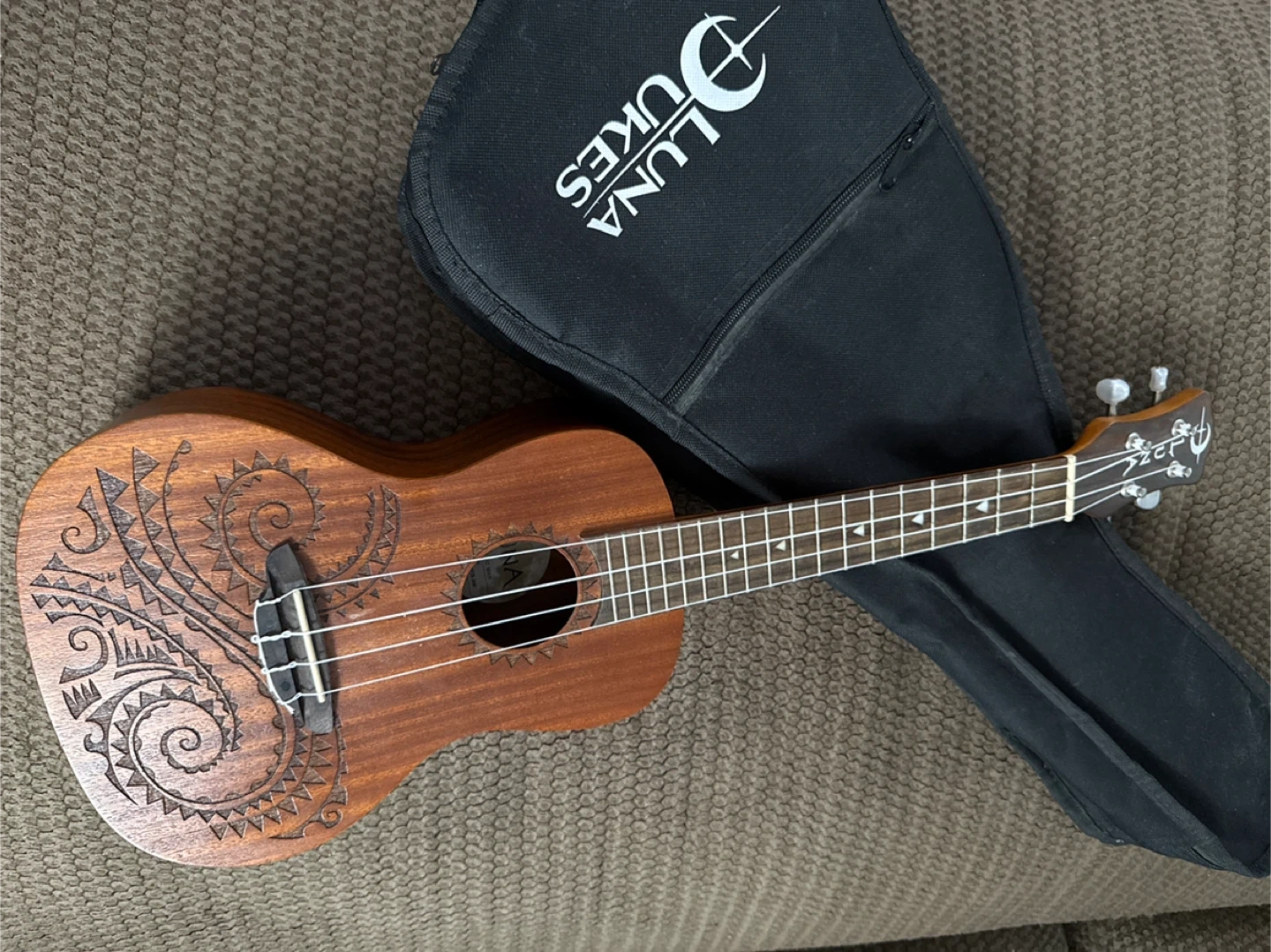 10Selling a Luna Ukes ukulele! It's in great condition and comes with its original gig bag. The ukulele has a beautiful design etched into the wood. Perfect for beginners or experienced players!