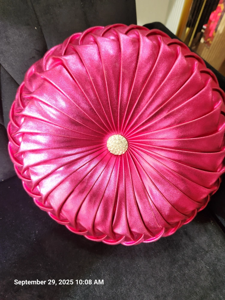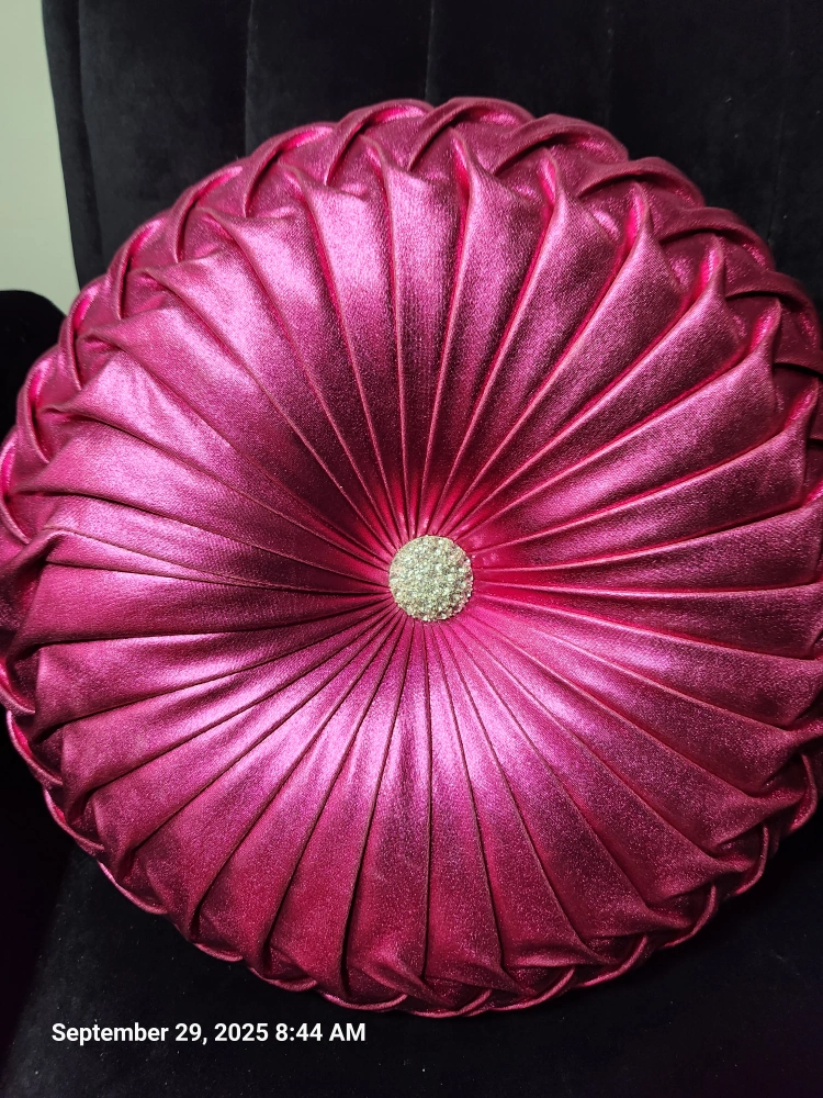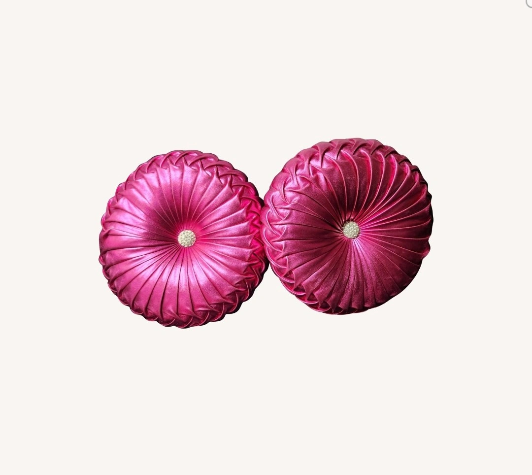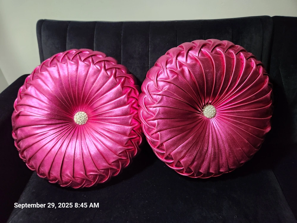 Add a pop of color to your home with this round decorative pillow! It features a unique design with a central decorative button. The pillow is in great condition and ready to brighten up any space. Only a few months old. Like-new condition. Seller's Notes:Luxe pillow set. Vibrant pink with jewel accents. Like new condition! Fashion meets elegance. Never used. In a pied-à-terre. I am redecorating.