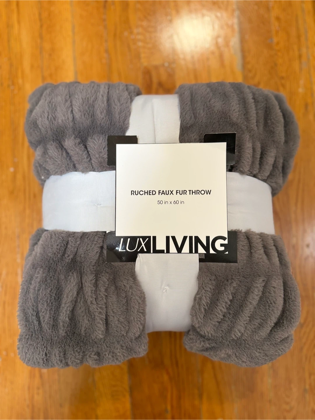 Selling a LuxLiving ruched faux fur throw. It's a cozy gray color and measures 50 inches by 60 inches. This blanket is sure to keep you warm!