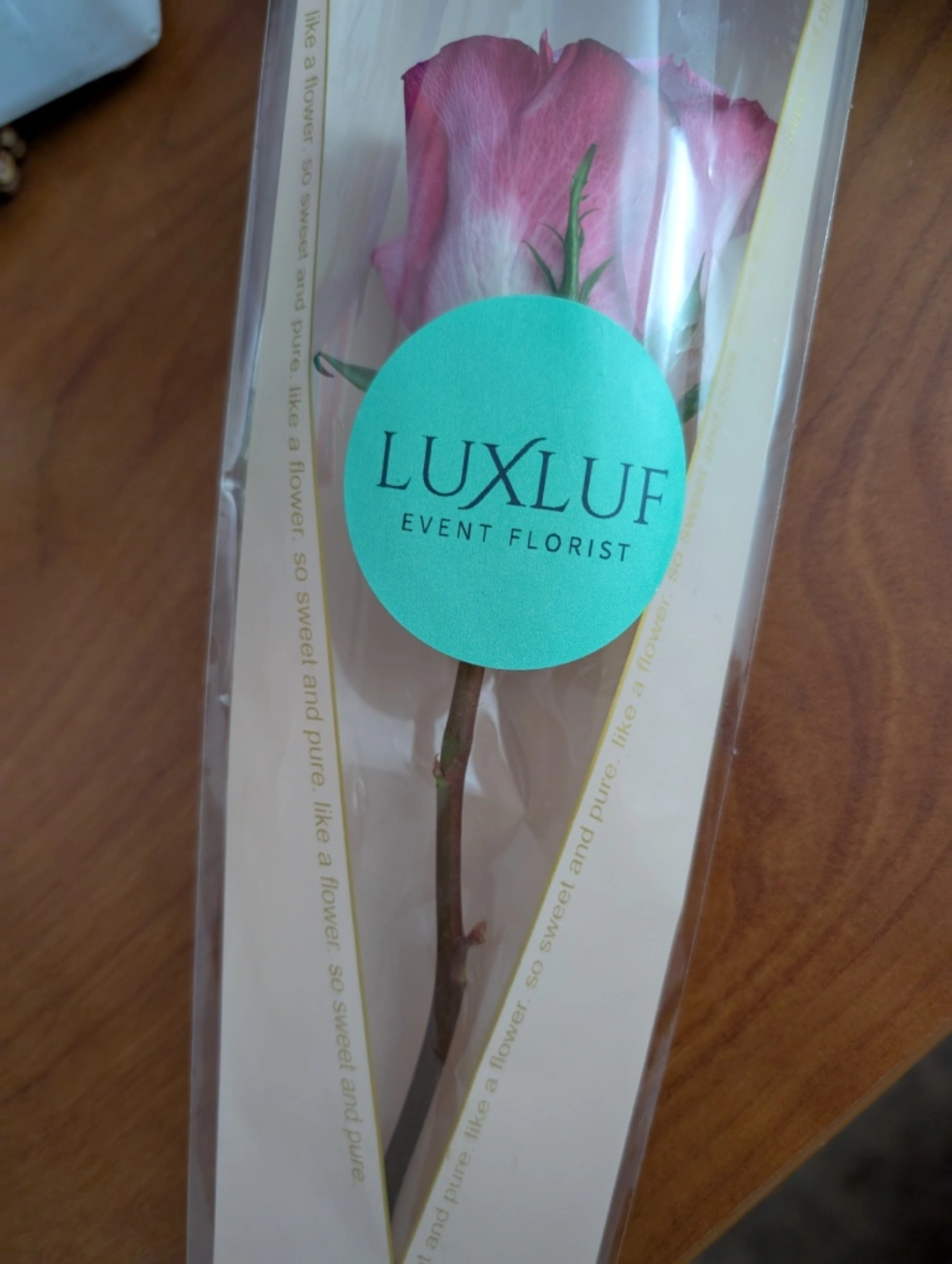 A beautiful rose from LUXLUF Event Florist, perfect for any occasion! It's delicately wrapped and ready to brighten someone's day. The packaging reads, 'like a flower, so sweet and pure'