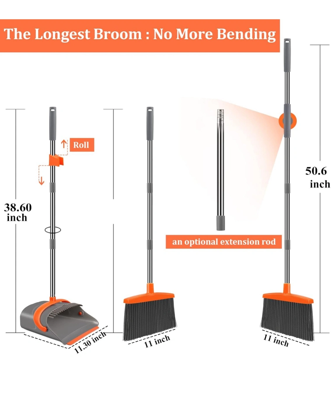 109Selling a brand new Luxurious Broom & Dustpan Set! The broom is designed to be the longest, so no more bending over. It extends to 50.6 inches and the dustpan is 11.3 inches wide. It also includes an optional extension rod