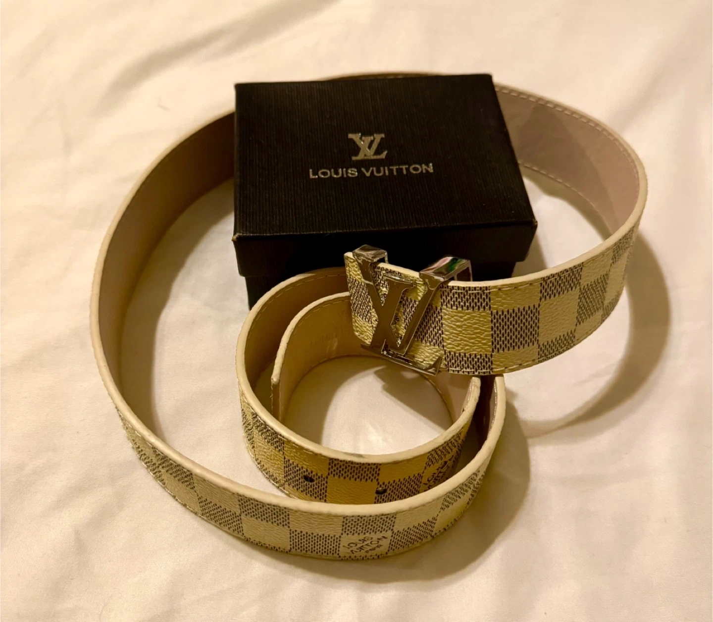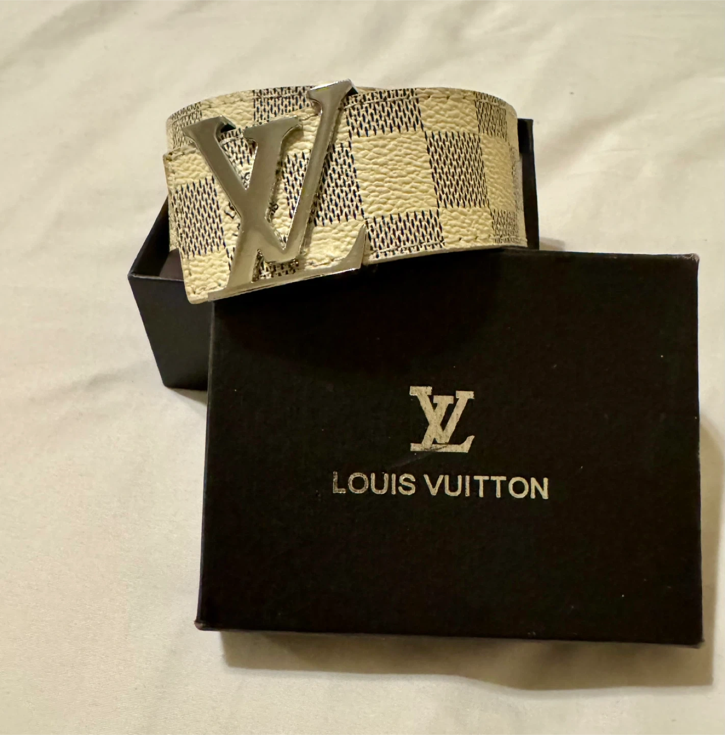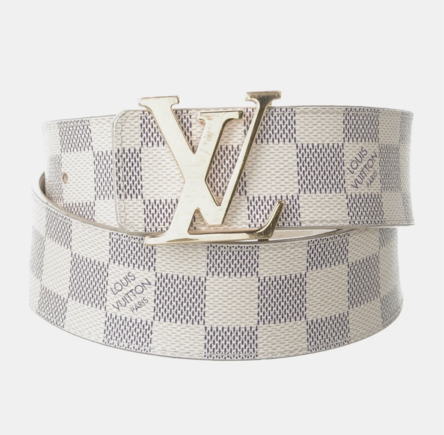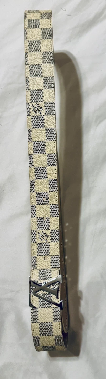 This is an authentic LOUIS VUITTON Damier Azur LV Initials Men’s/ Women’s belt Belt in size 48/120 Color cream/grey This classic belt is crafted of signature Damier Azur silver and cream color Leather lining. The belt features a silver LV logo belt buckle with "LV" initials hardware. This is a stylish versatile belt that can be worn on many different occasions, Very stylish checkered strap New in box