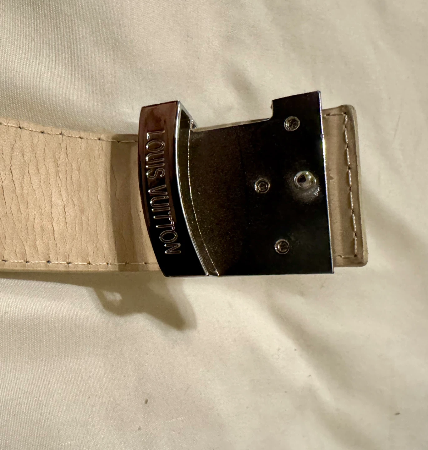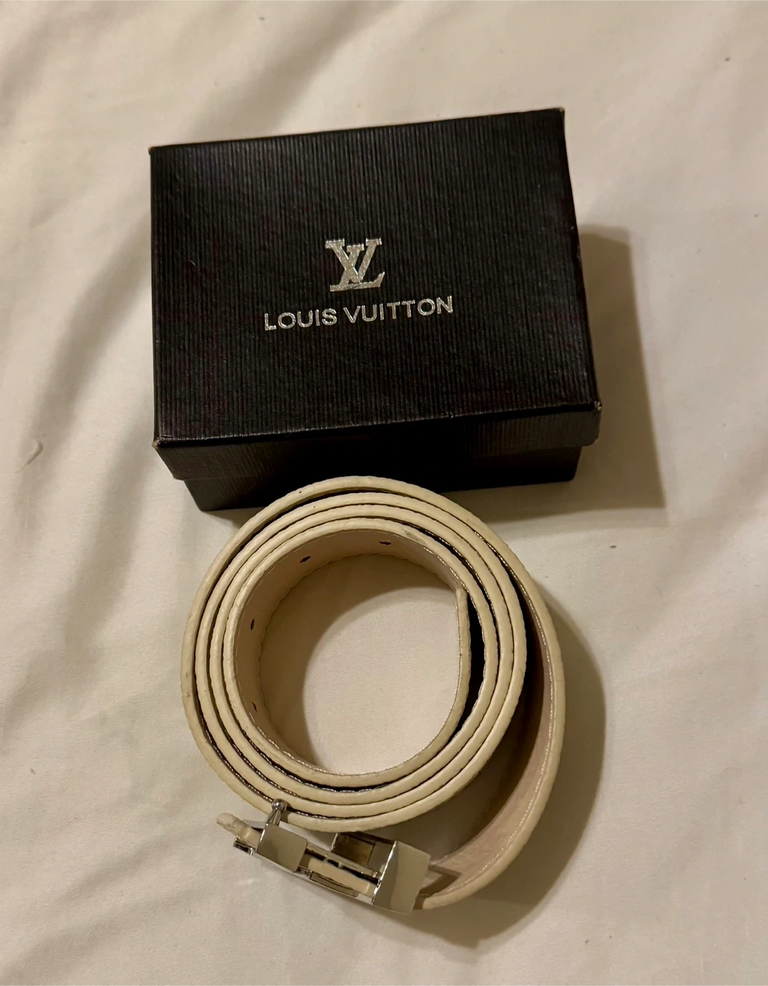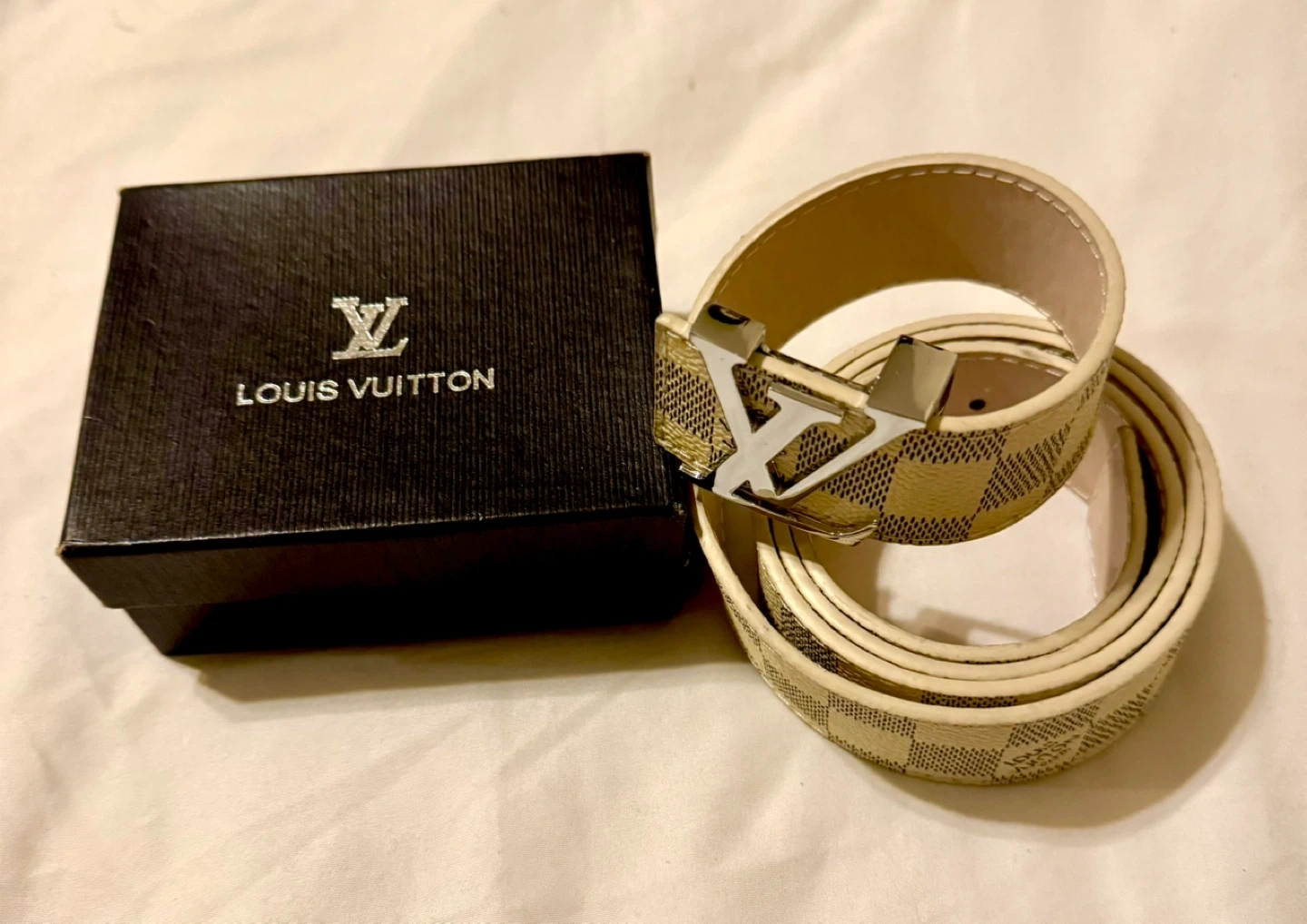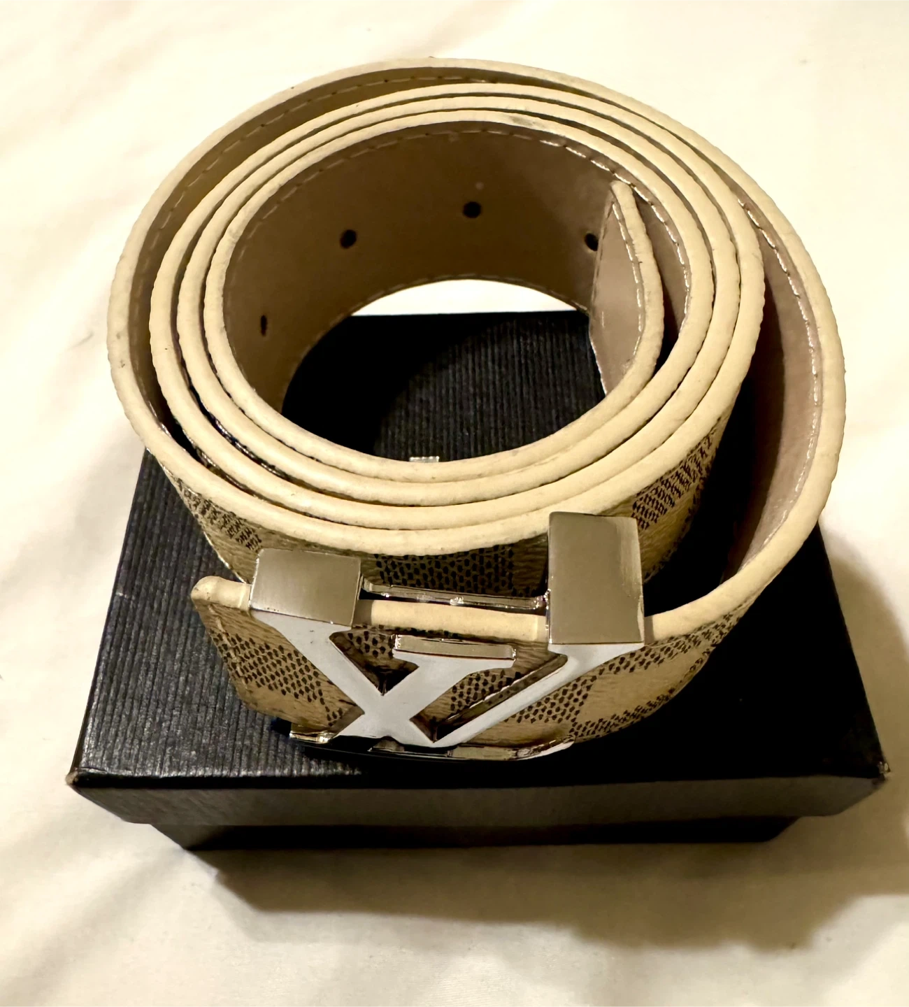 This is an authentic LOUIS VUITTON Damier Azur LV Initials Men’s/ Women’s belt Belt in size 48/120 Color cream/grey This classic belt is crafted of signature Damier Azur silver and cream color Leather lining. The belt features a silver LV logo belt buckle with "LV" initials hardware. This is a stylish versatile belt that can be worn on many different occasions, Very stylish checkered strap New in box