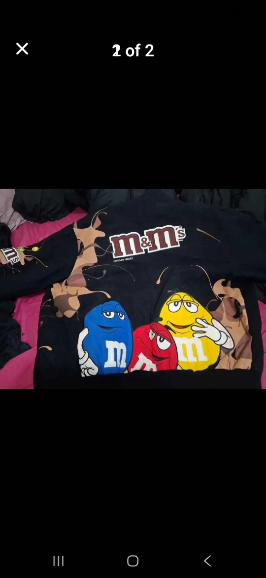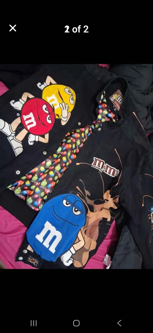 Selling a fun M&M's themed black jacket! It features colorful M&M's characters and designs. A unique piece to add to your wardrobe!