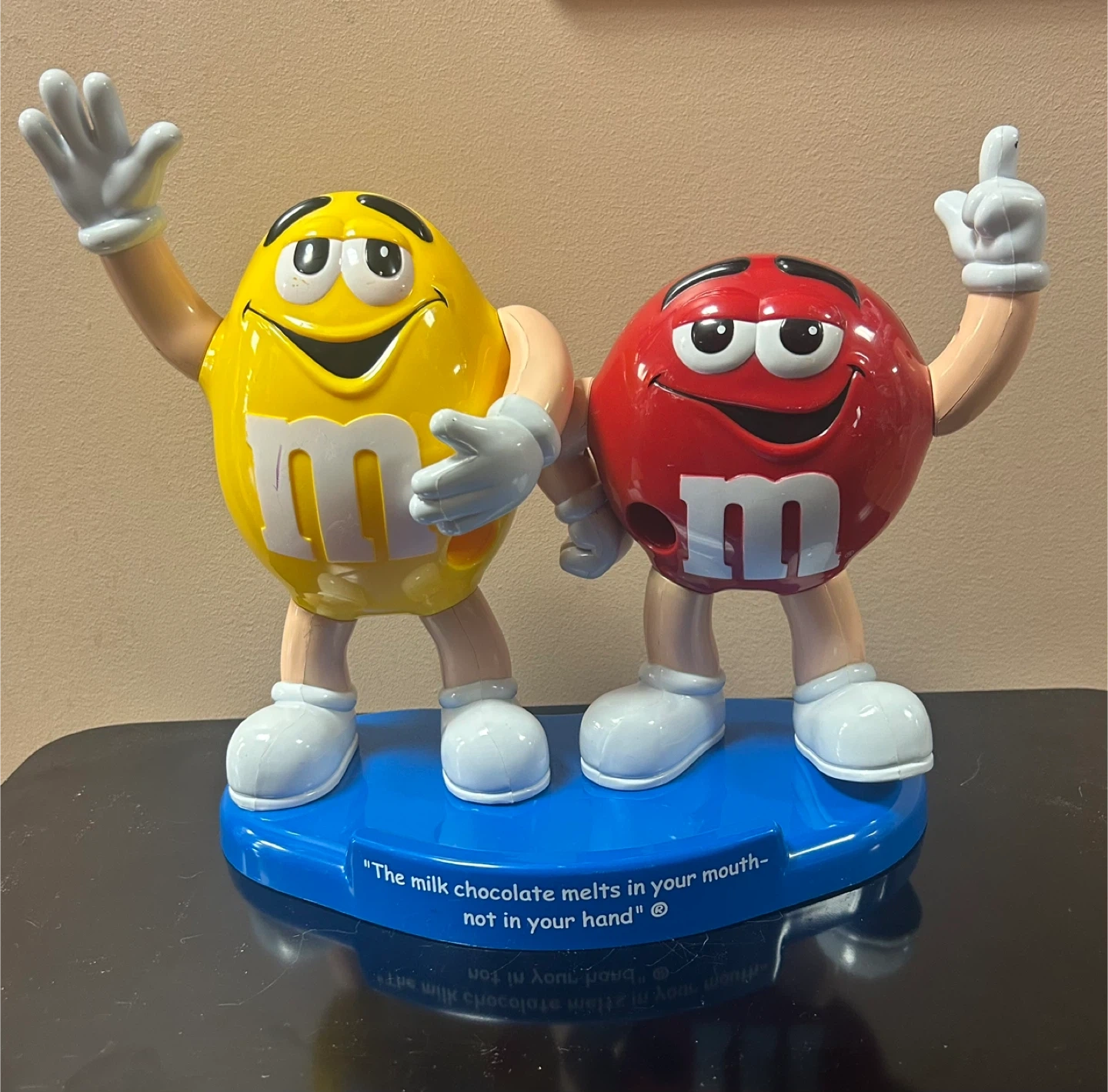 10This is a fun M&M's candy dispenser featuring the yellow and red characters. It's in great shape and ready to add some character to your space! The base reads, "The milk chocolate melts in your mouth - not in your hand".