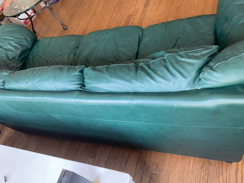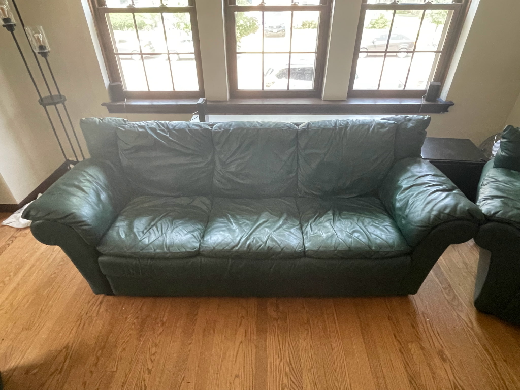 Selling a green leather sofa. It's a comfortable and stylish piece that would look great in any living room. Perfect for relaxing and entertaining guests