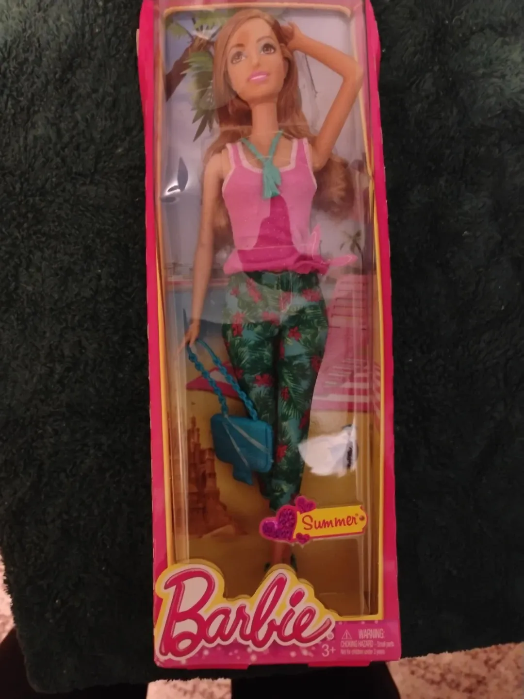 This is a Barbie doll dressed for summer. It includes a pink top, tropical print pants, and a blue handbag. The doll is in its original packaging.