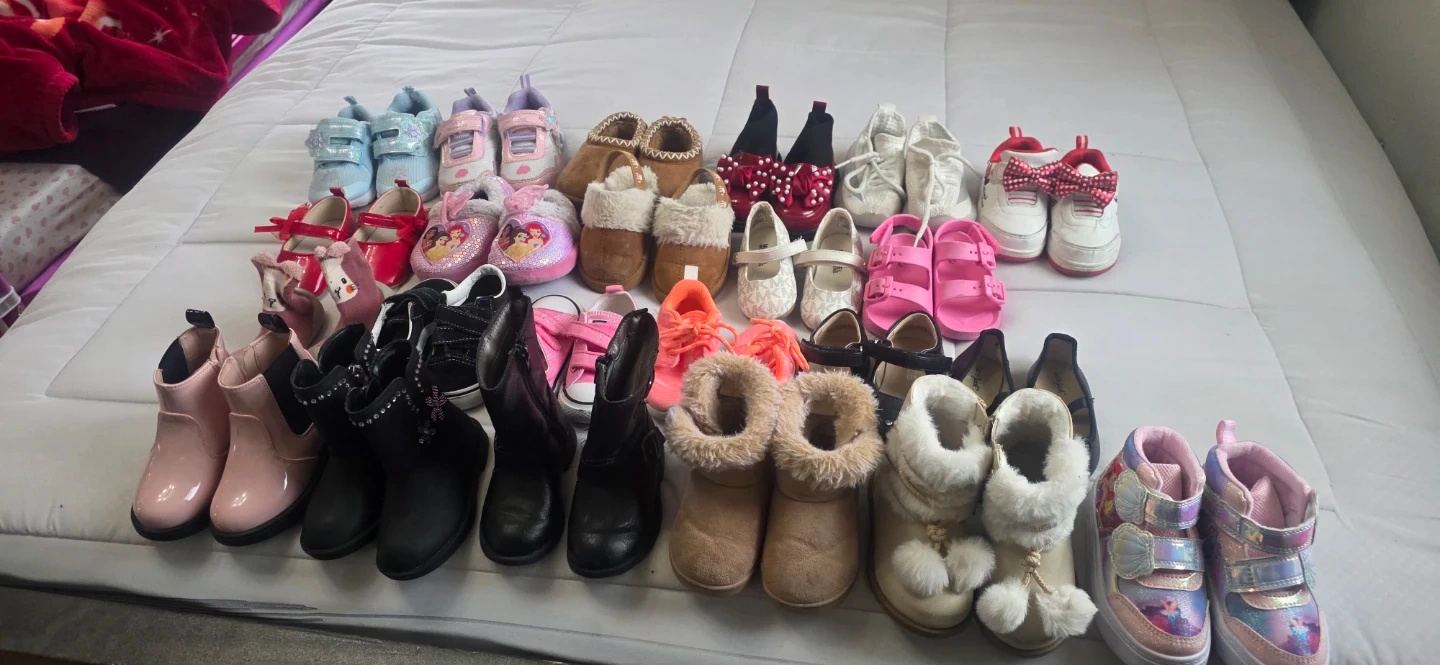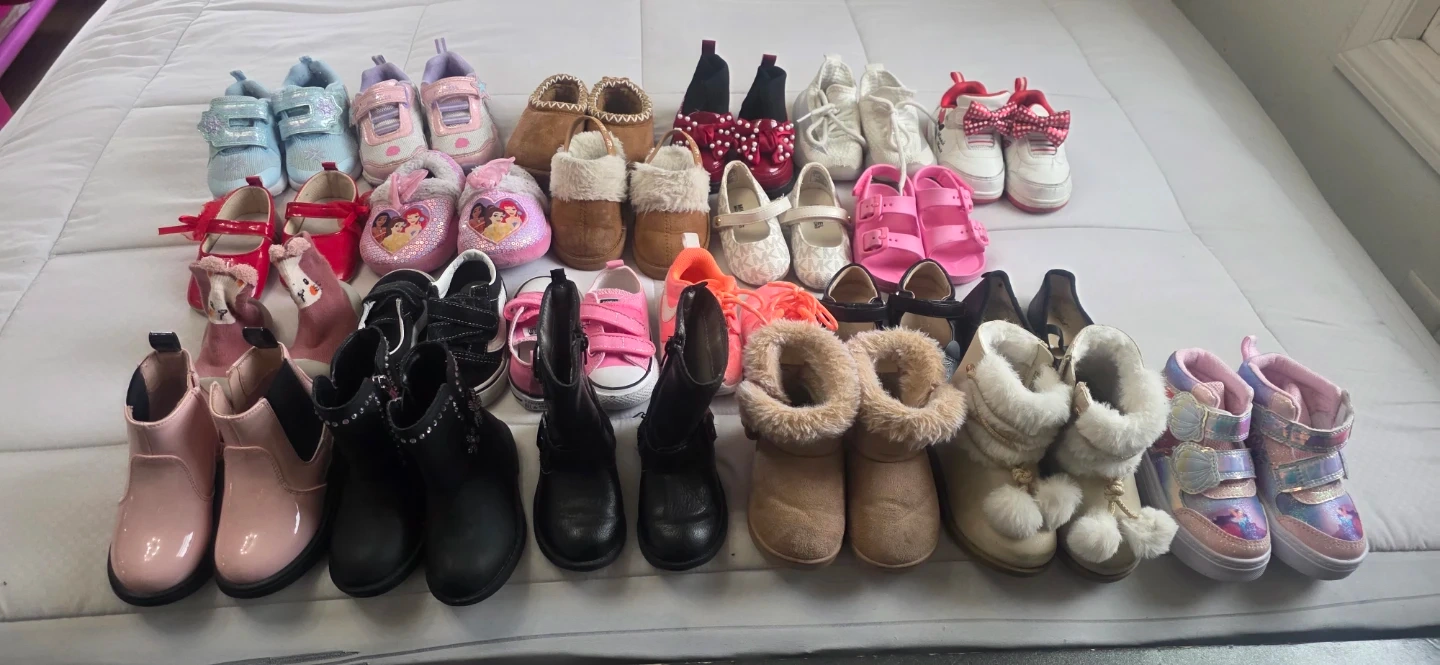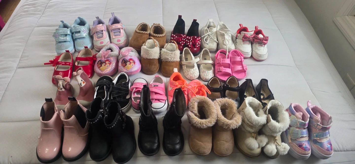 This is a collection of various girls' shoes. It includes sneakers, boots, and dress shoes. Sizes appear to be mixed toddler and little kid sizes.