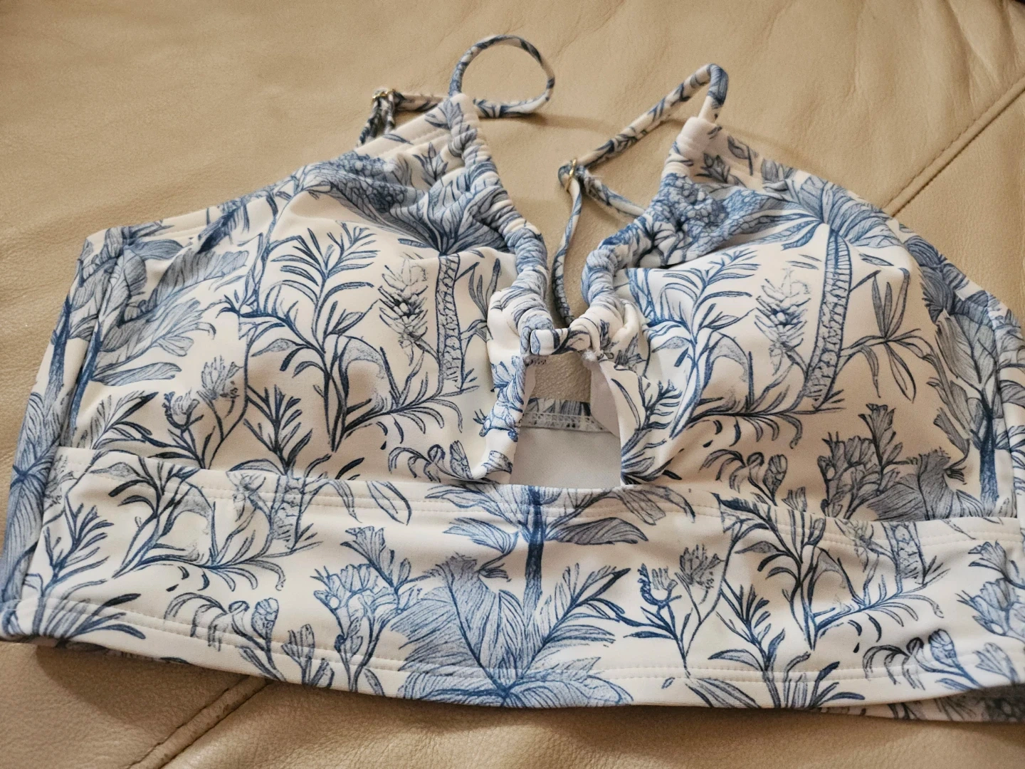 Blue and white floral print bikini top. Lining made with at least 90% recycled polyester. Size M (8-10).