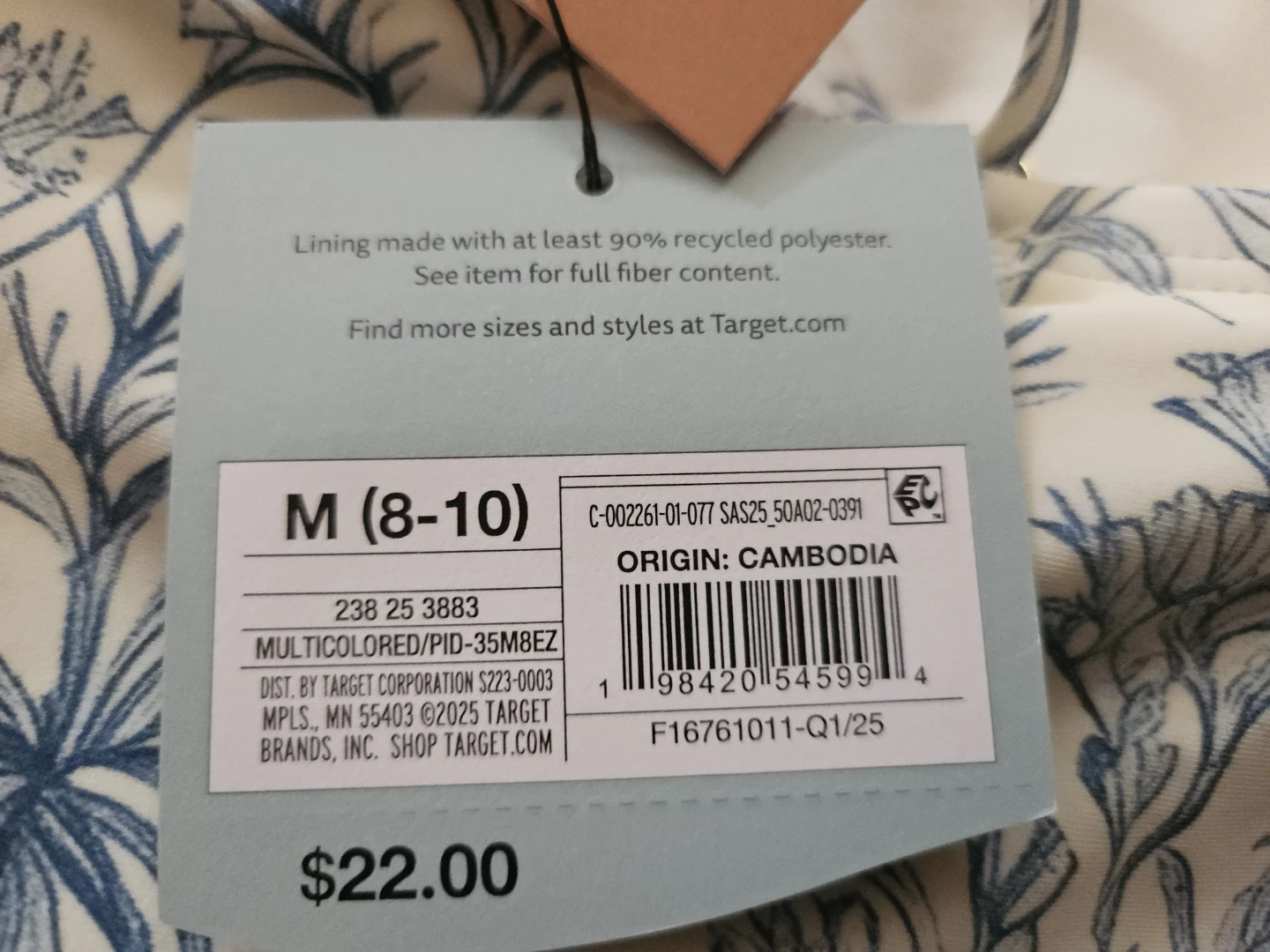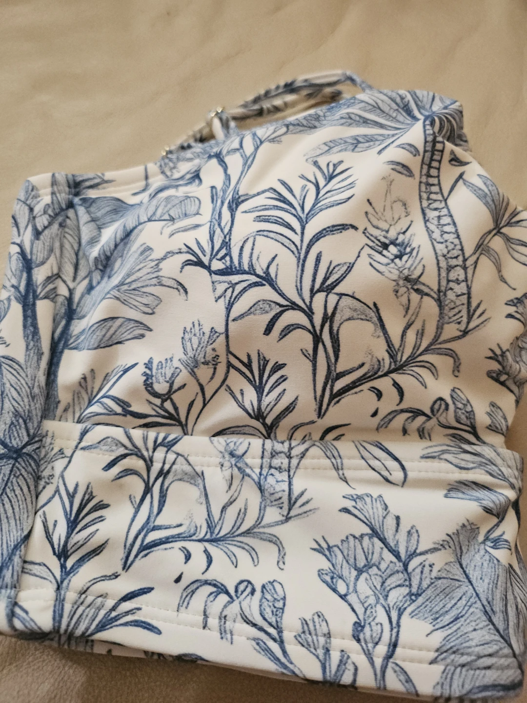 Blue and white floral print bikini top. Lining made with at least 90% recycled polyester. Size M (8-10).