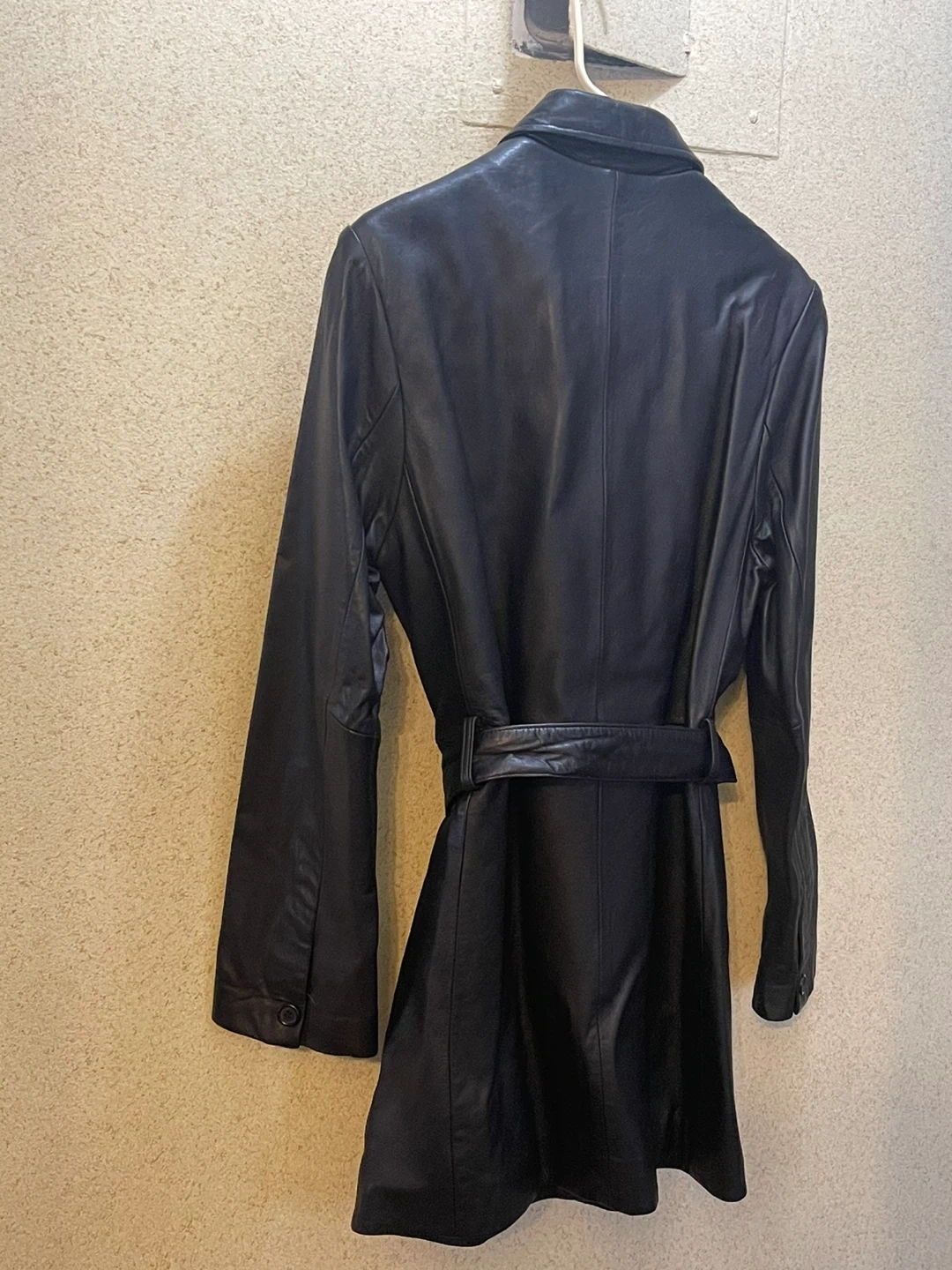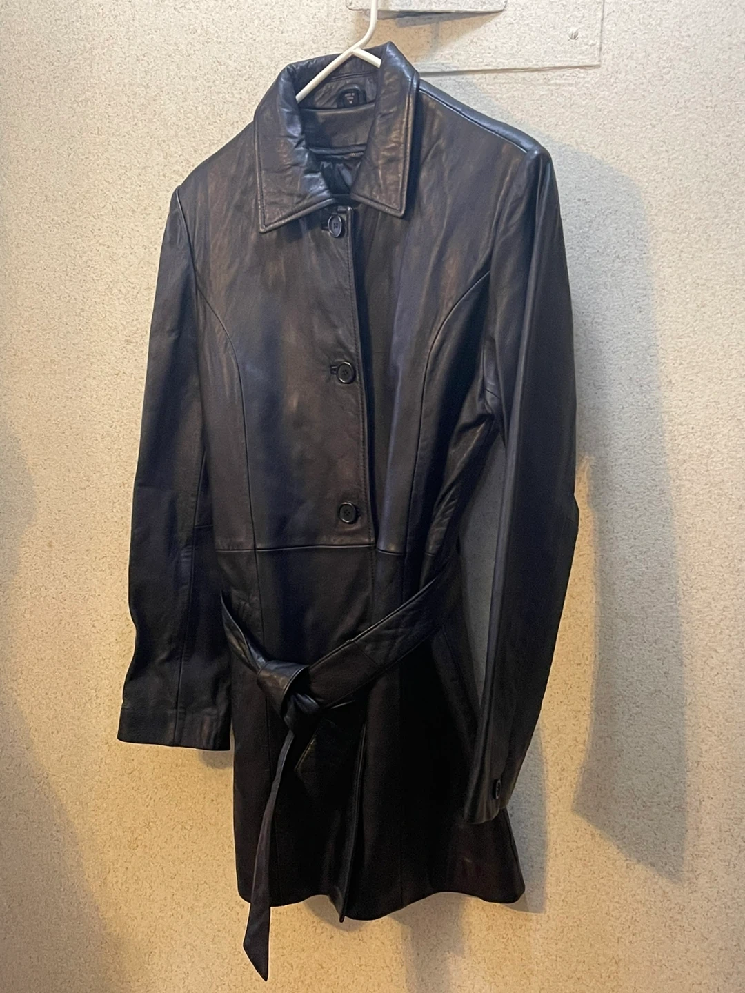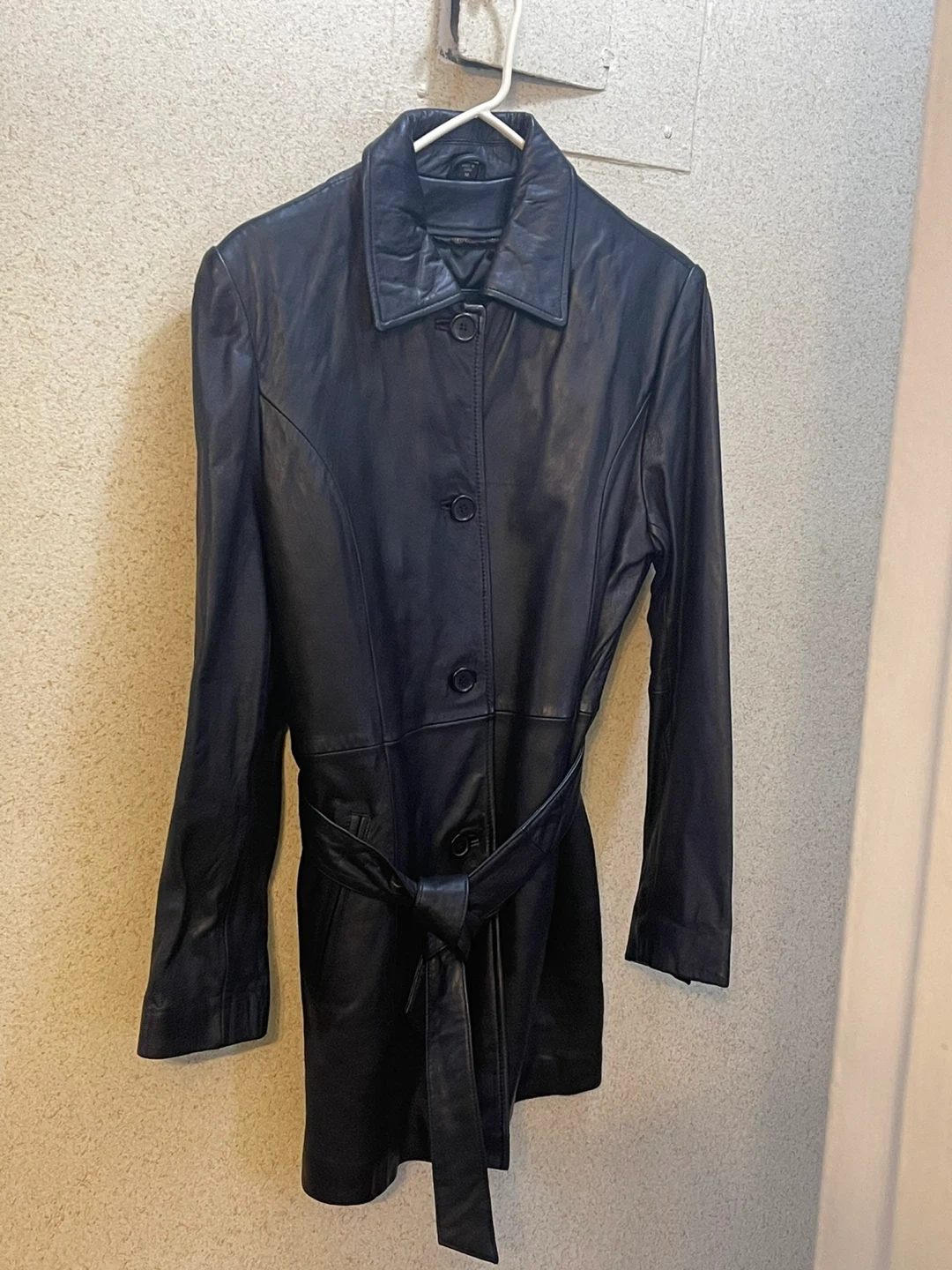 Classic black leather trench coat. It's a stylish piece with a flattering belted waist. Genuine leather material. Size M. Price $55 negotiable
