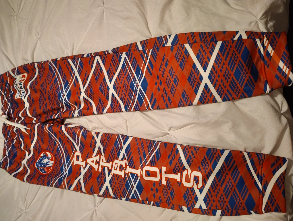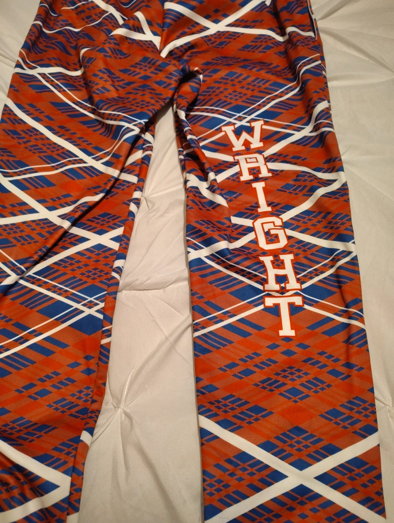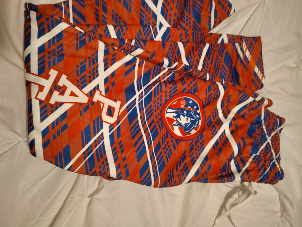 These are Patriots jogger pants with the name 'Wright' on them. They feature a unique red, blue, and white pattern and the Patriots logo. Great for showing your team spirit!
