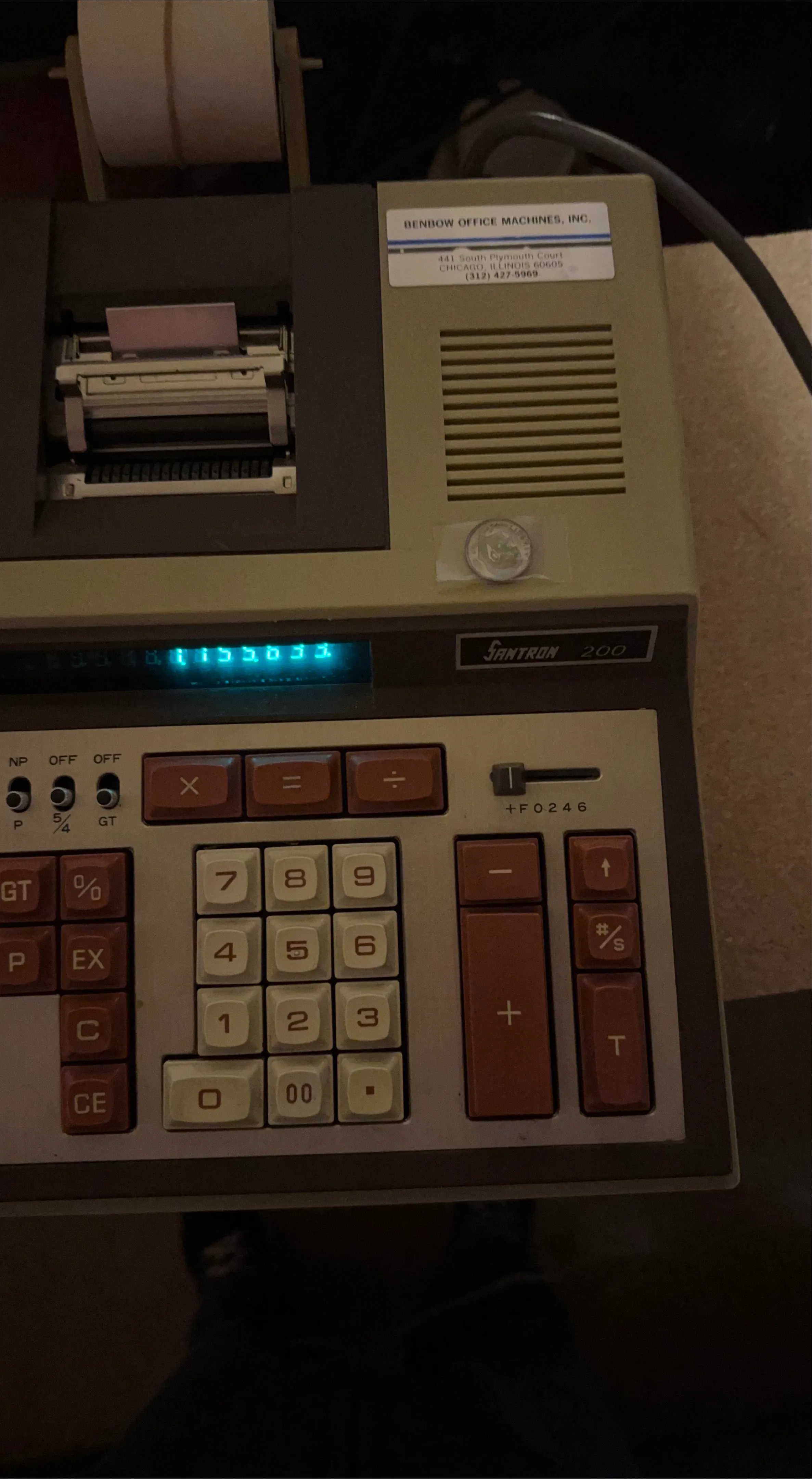 This is a Santron 200 printing calculator. It includes a roll of paper for printing calculations. It has a full keypad and a bright digital display.