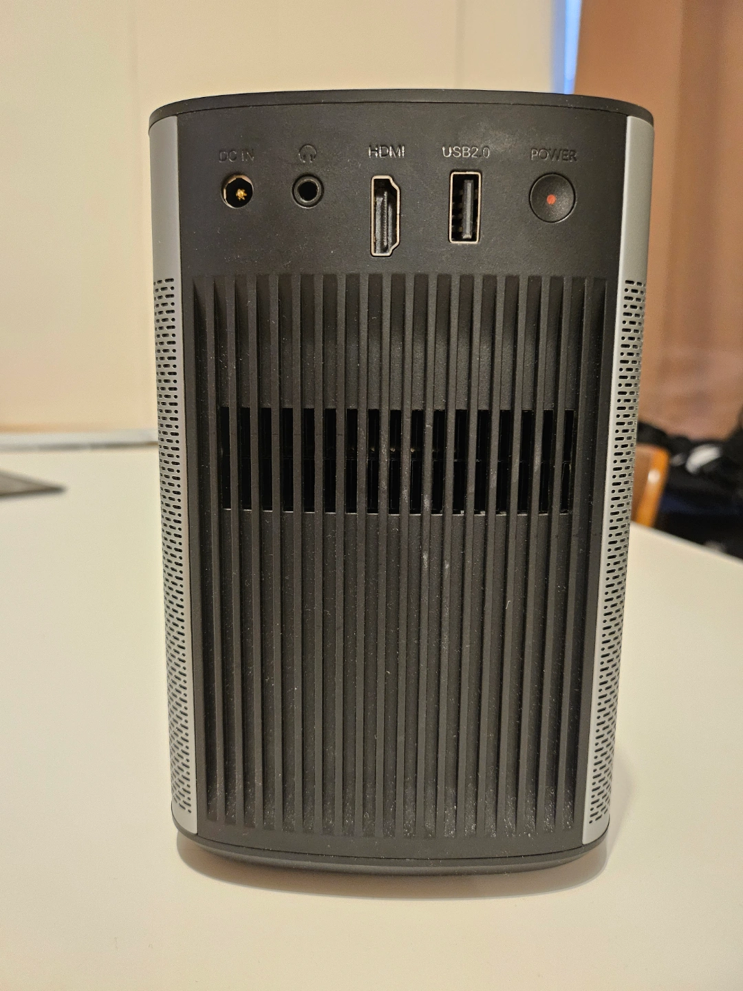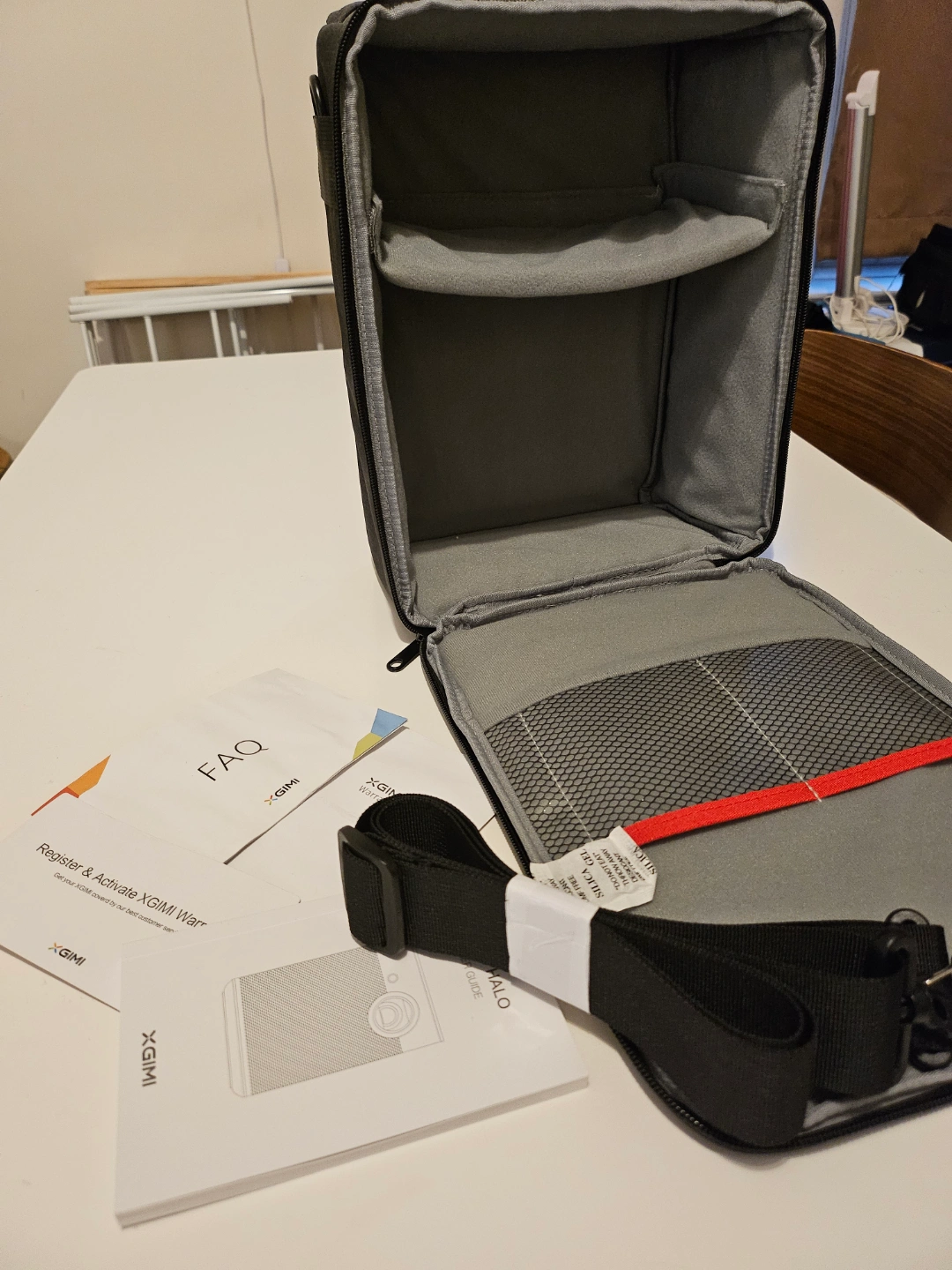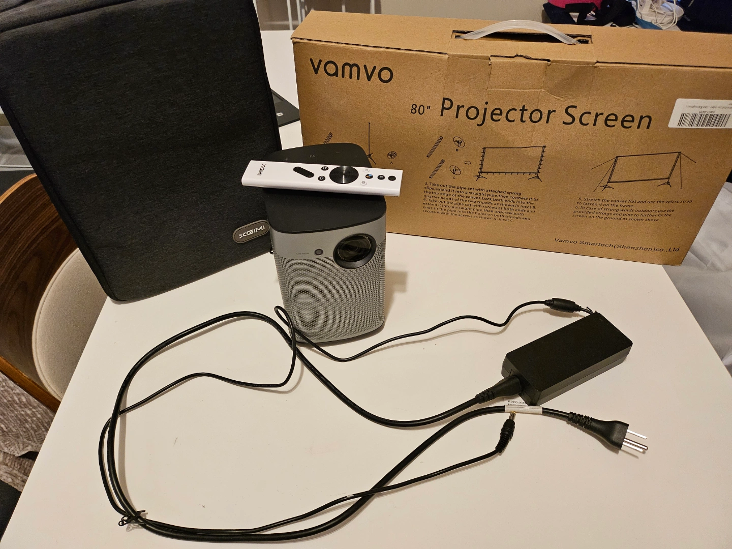 Portable projector. Great picture quality. Includes carrying case, remote, power adapter, and outdoor screen.