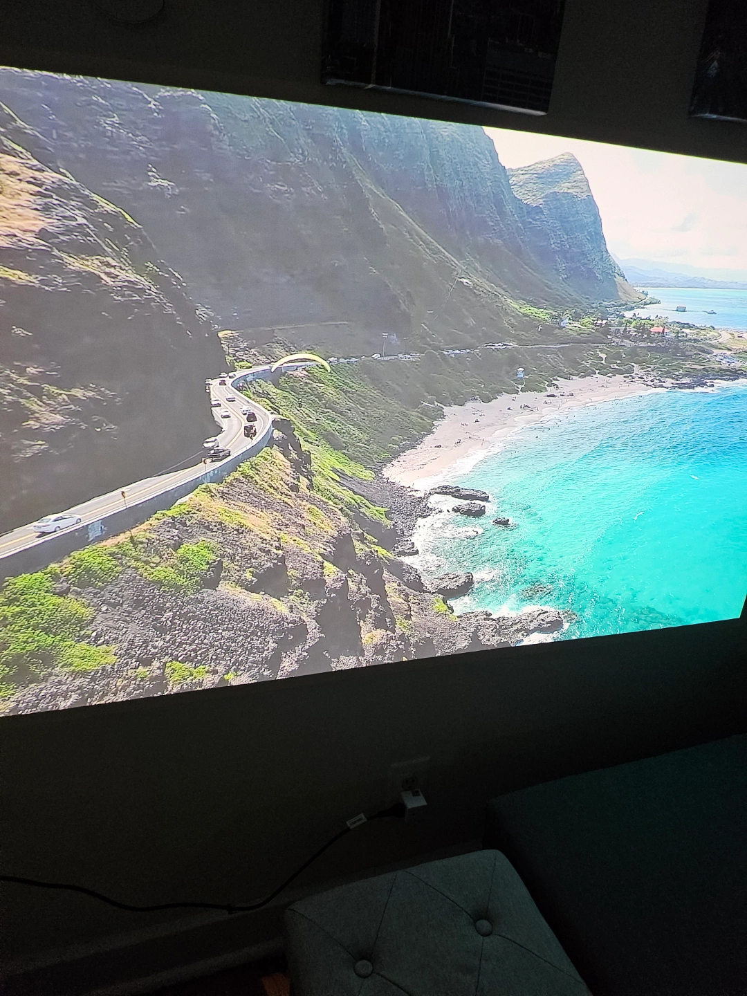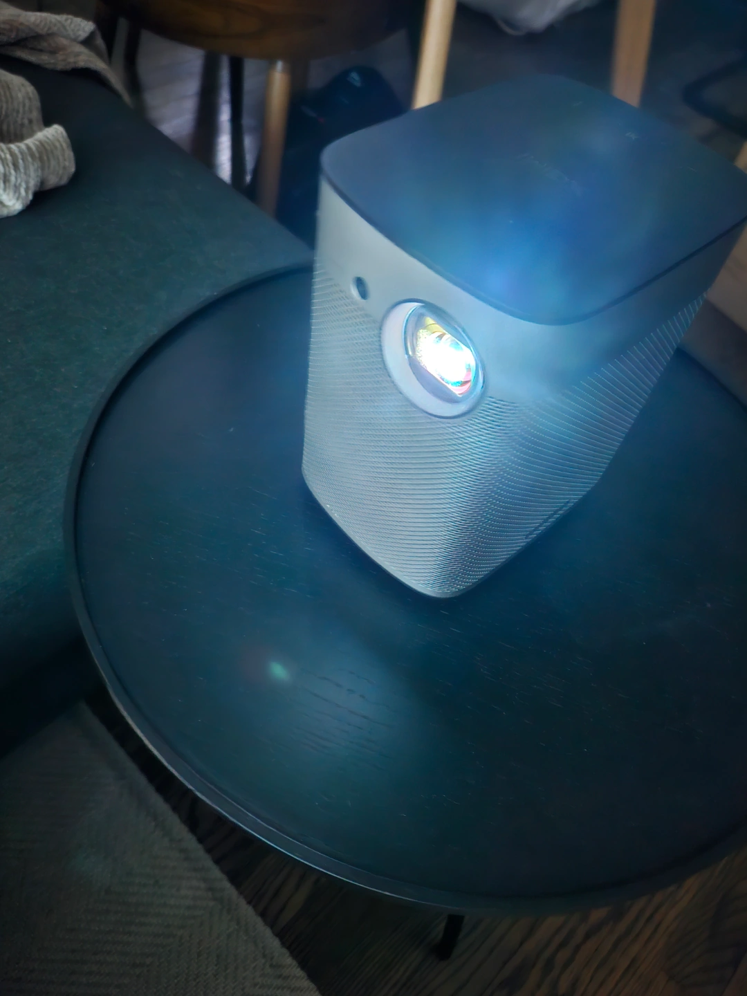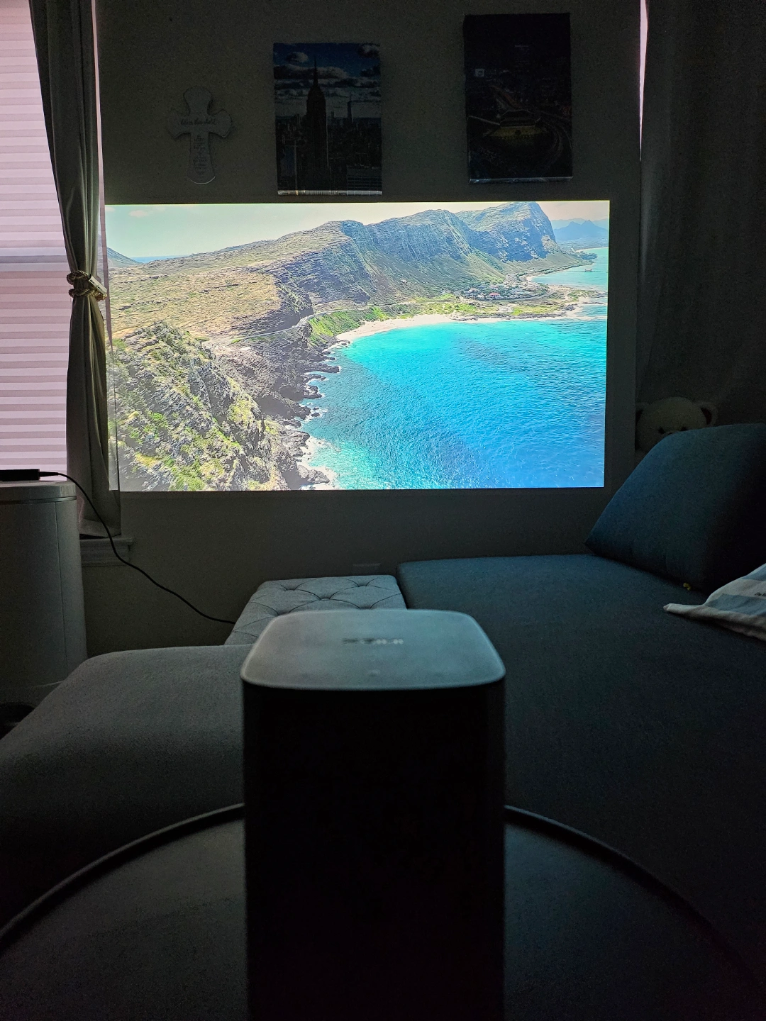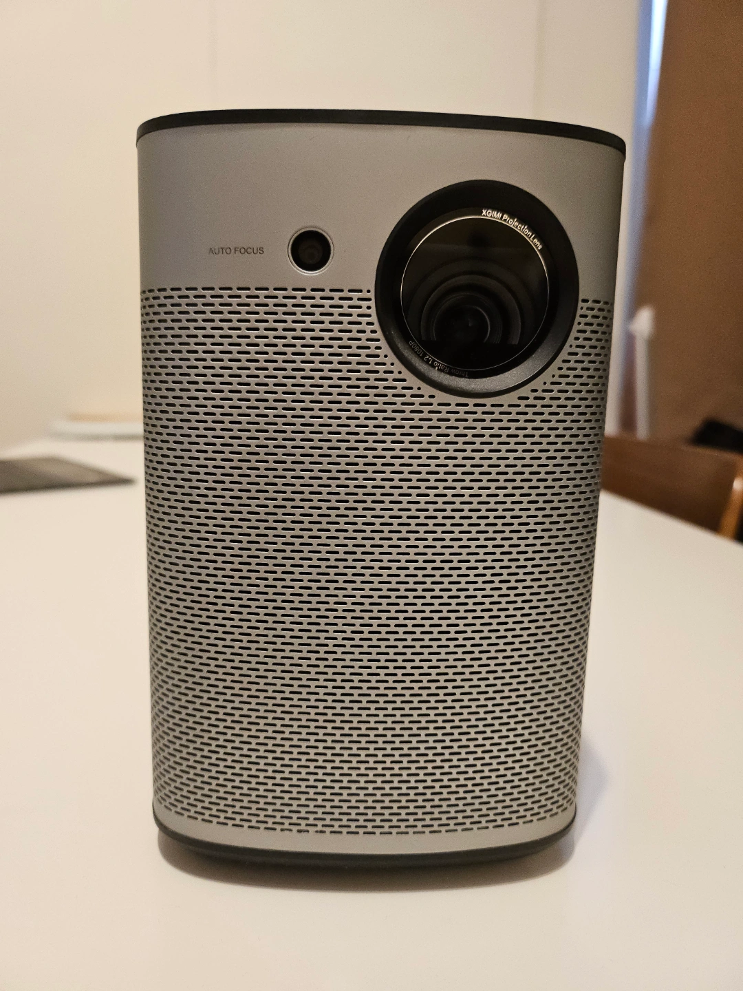 Portable projector. Great picture quality. Includes carrying case, remote, power adapter, and outdoor screen.