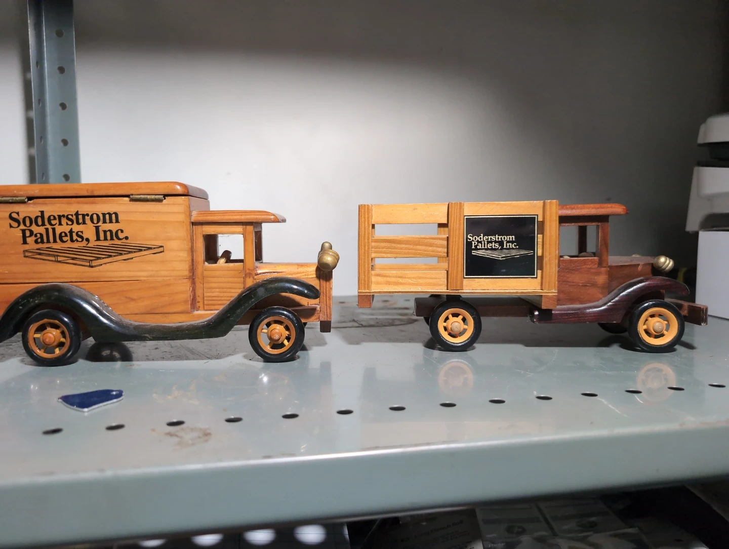 Two wooden toy trucks from Soderstrom Pallets, Inc. One features a closed box truck design and the other has an open flatbed. Crafted from wood with metal accents.