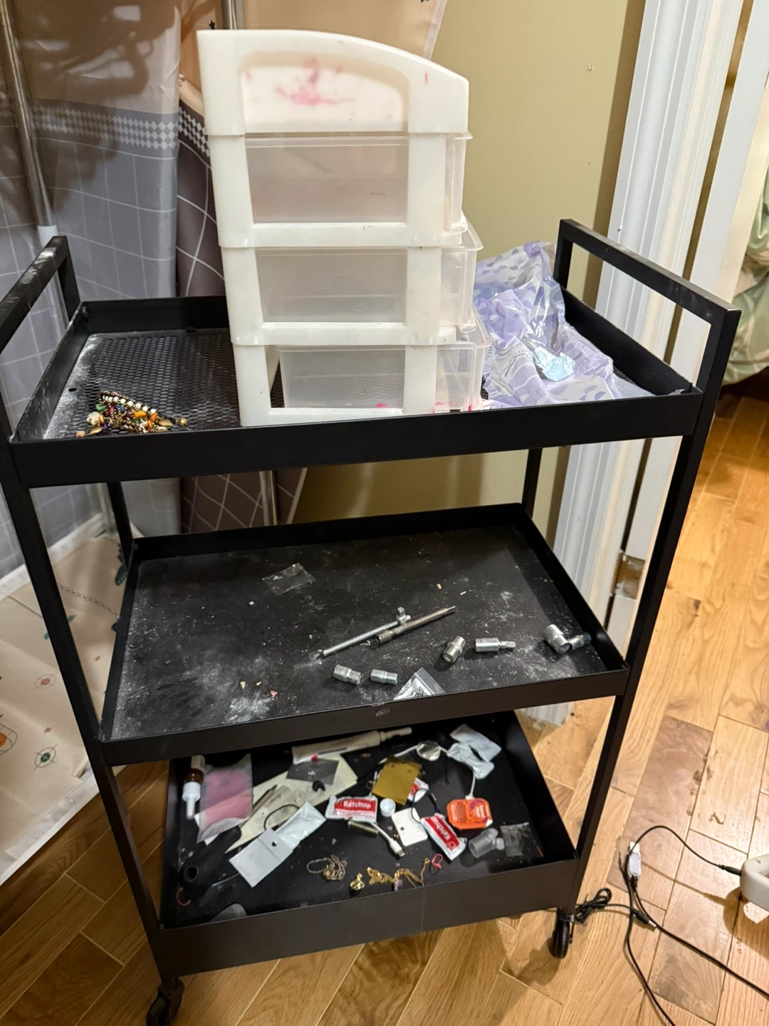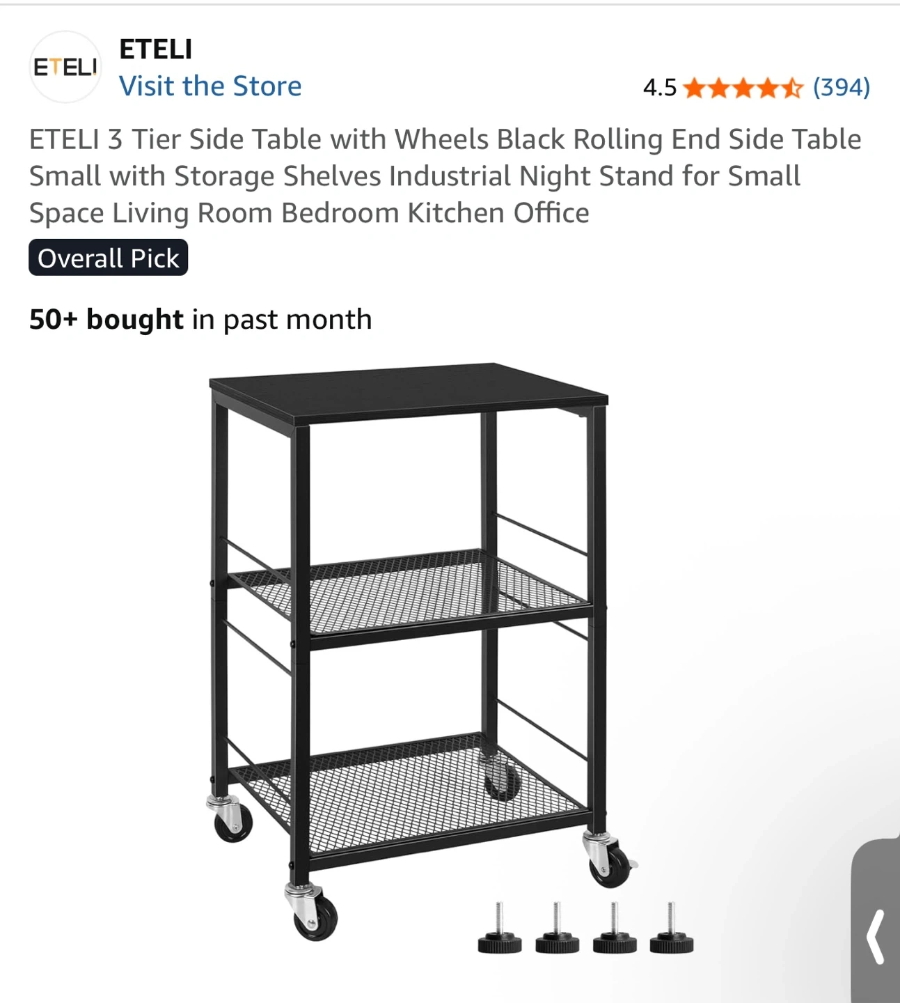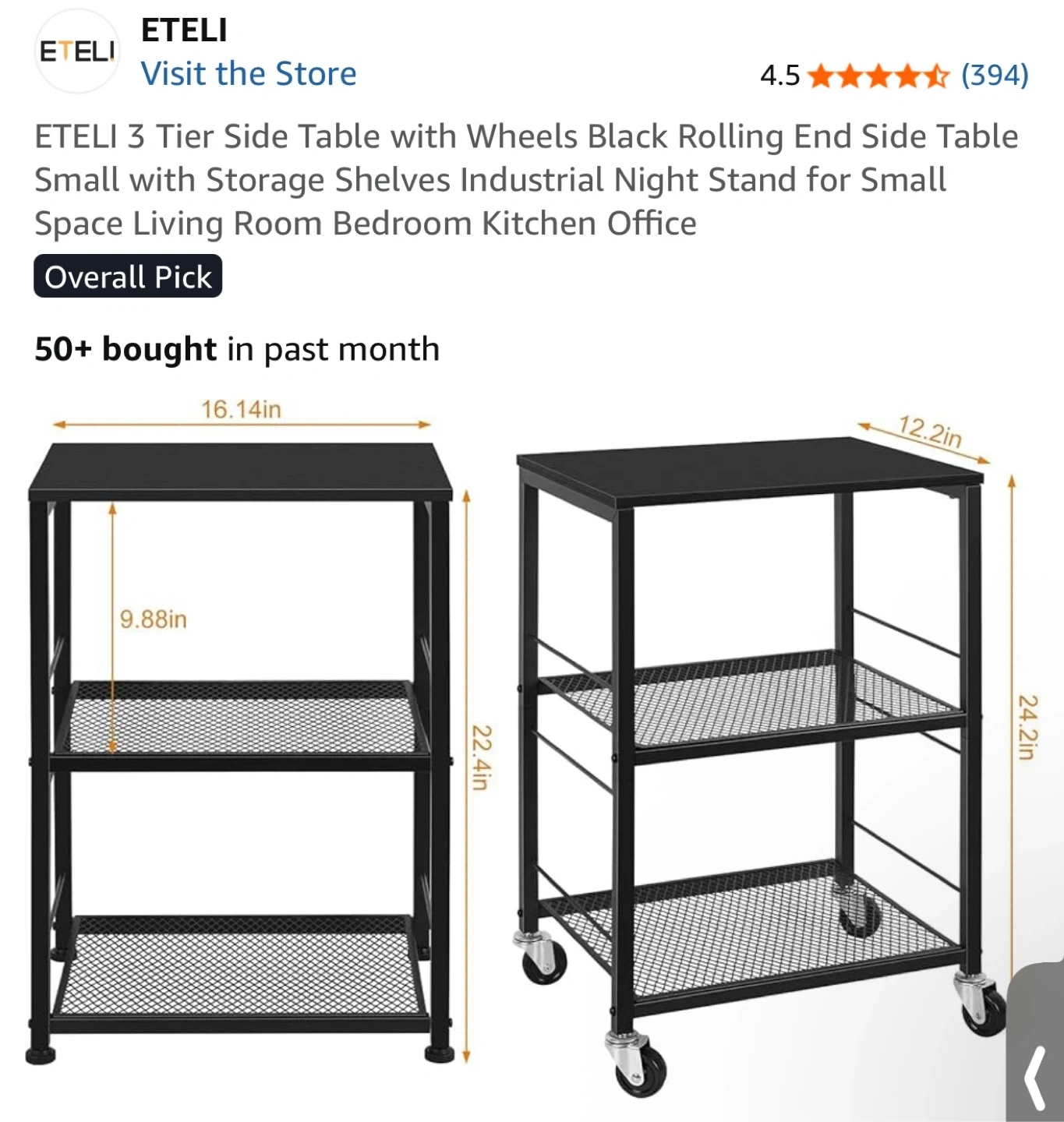 Selling a black ETELI 3 tier side table with wheels! Great for small spaces like living rooms, bedrooms, kitchens, or offices. It features storage shelves and an industrial night stand design