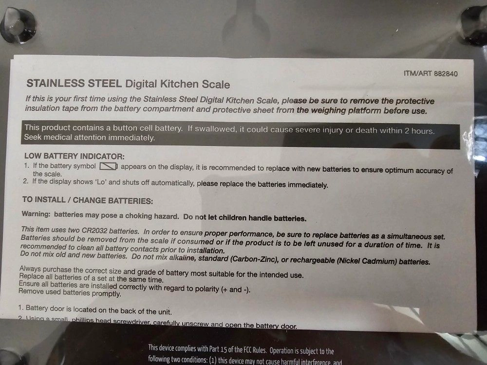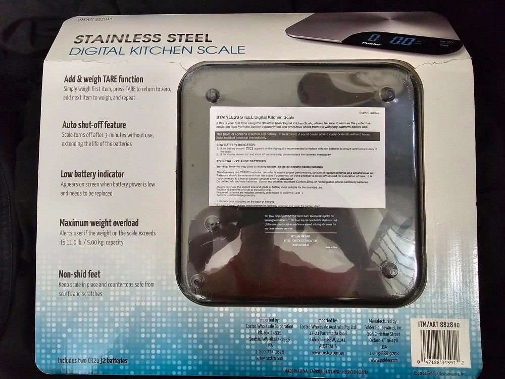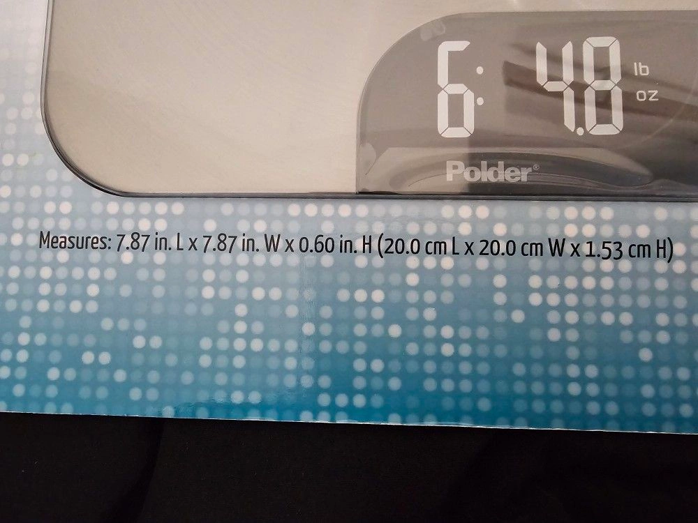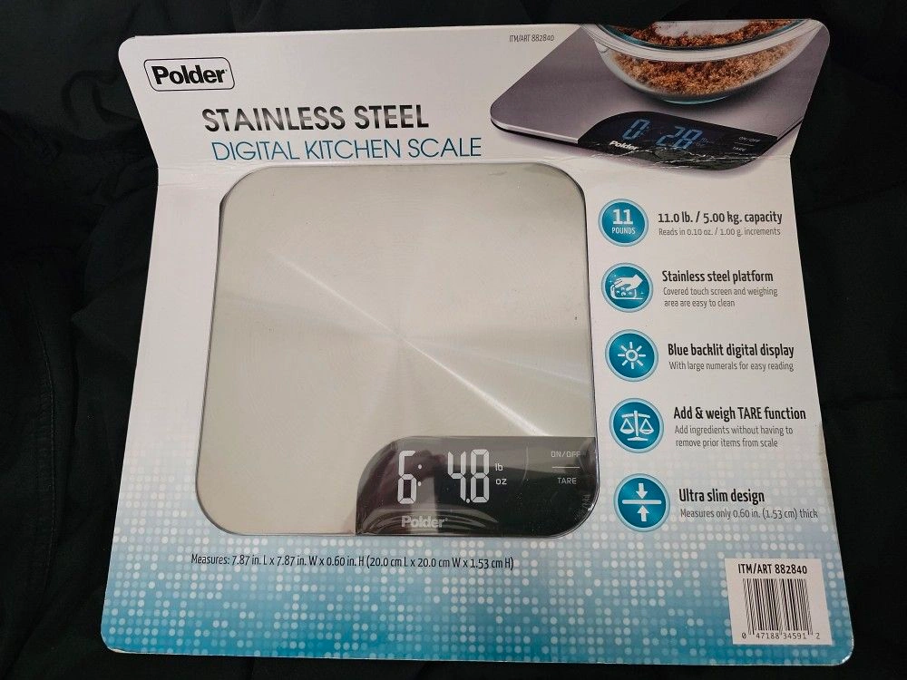 BRAND NEW POLDER STAINLESS STEEL DIGITAL KITCHEN SCALE. Measures: 7.87"L x 7.87"W x 0.60". Model #882840. Capacity 11.0lb/5.00kg. Blue Backlit Digital Display. Includes 2 brand new batteries. UltraSlim Design. I have 2 scales available, both the same, both brand new ($45 for 2). Color: Silver. Material: Stainless steel.