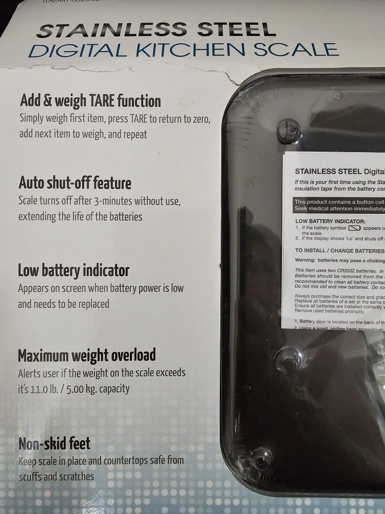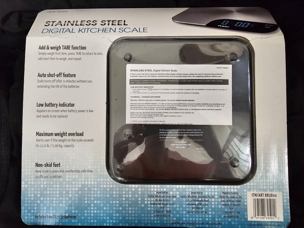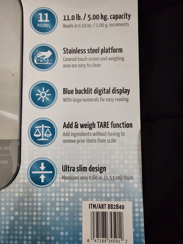 BRAND NEW POLDER STAINLESS STEEL DIGITAL KITCHEN SCALE. Measures: 7.87"L x 7.87"W x 0.60". Model #882840. Capacity 11.0lb/5.00kg. Blue Backlit Digital Display. Includes 2 brand new batteries. UltraSlim Design. I have 2 scales available, both the same, both brand new ($45 for 2). Color: Silver. Material: Stainless steel.