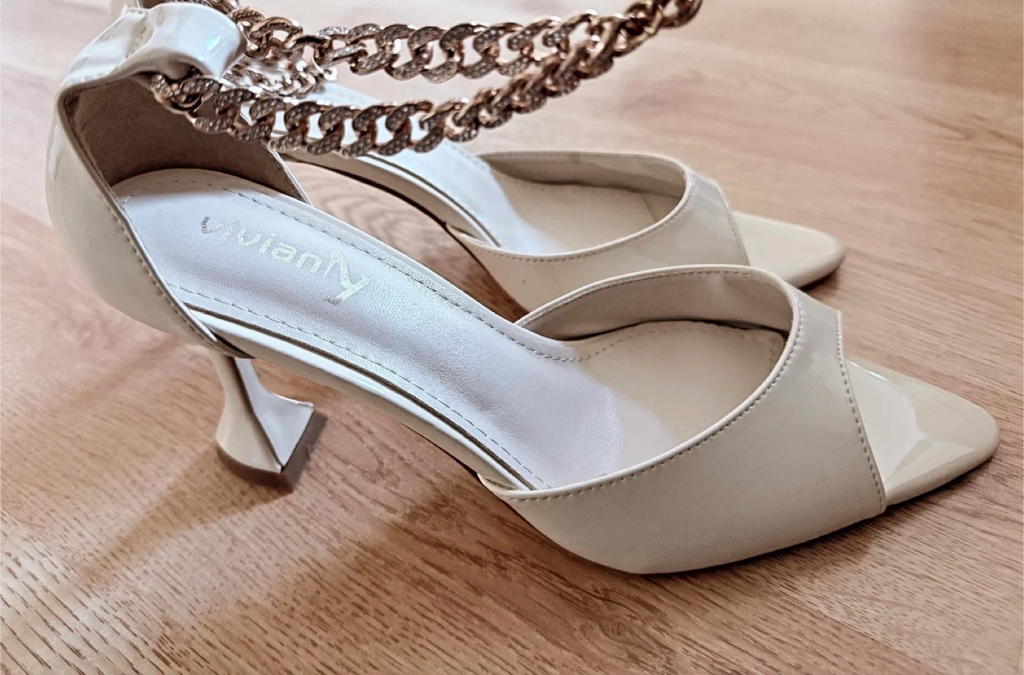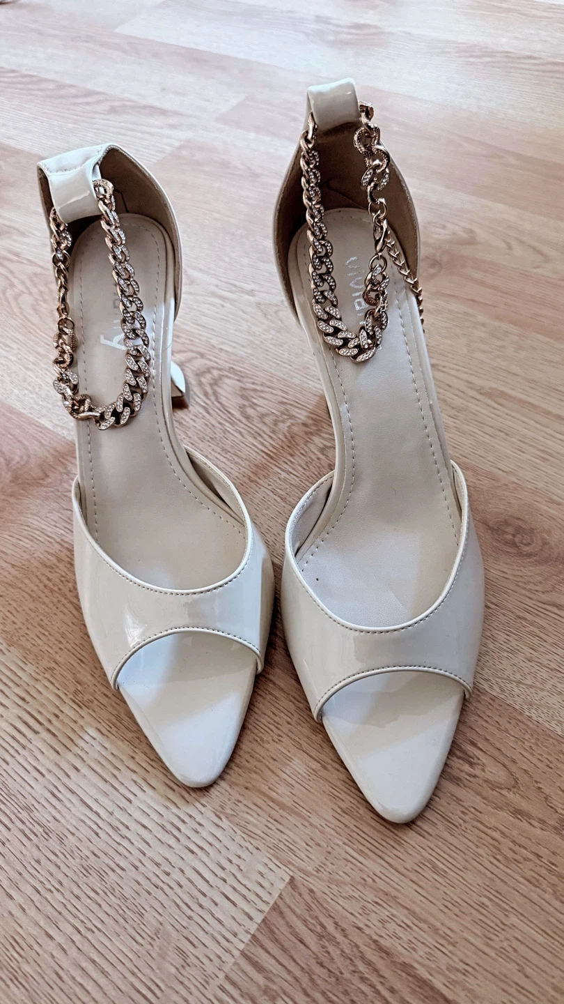 Selling a pair of new chained heels in a cream color. They are a size 9 and feature a unique chain detail. These heels are perfect for dressing up any outfit!