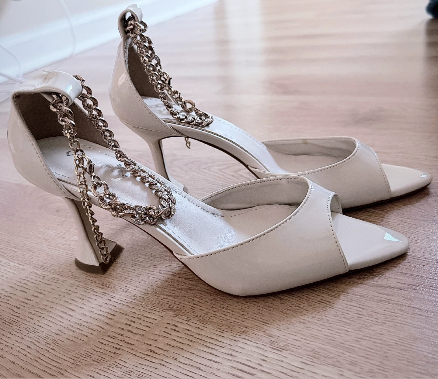 Selling a pair of new chained heels in a cream color. They are a size 9 and feature a unique chain detail. These heels are perfect for dressing up any outfit!