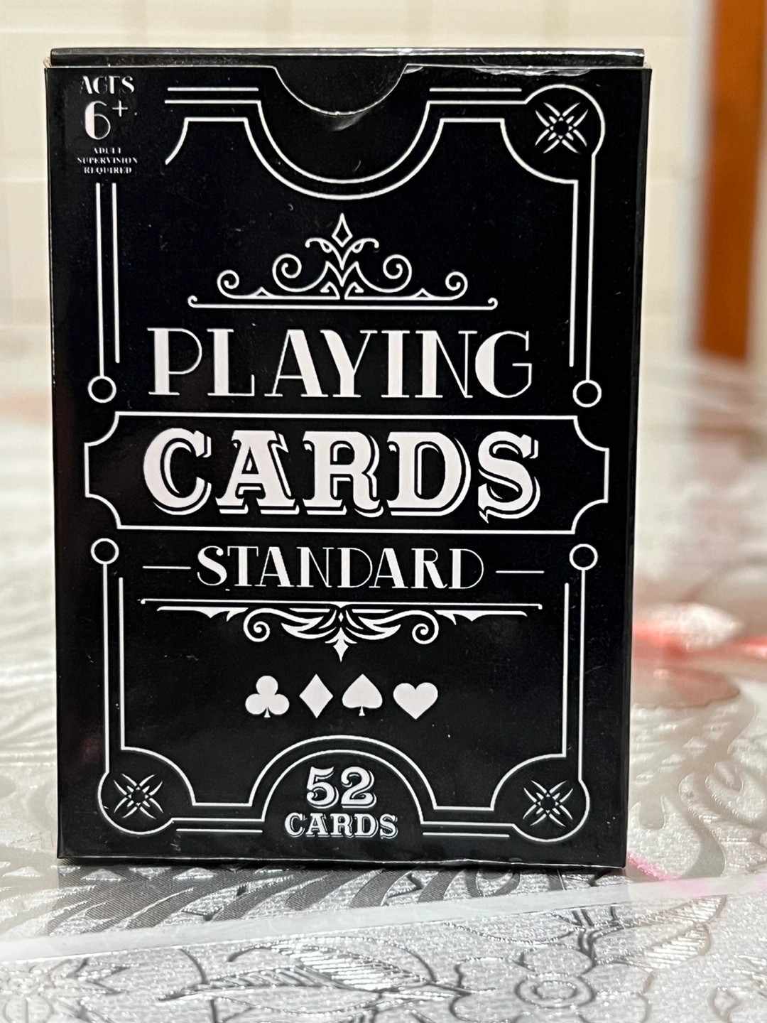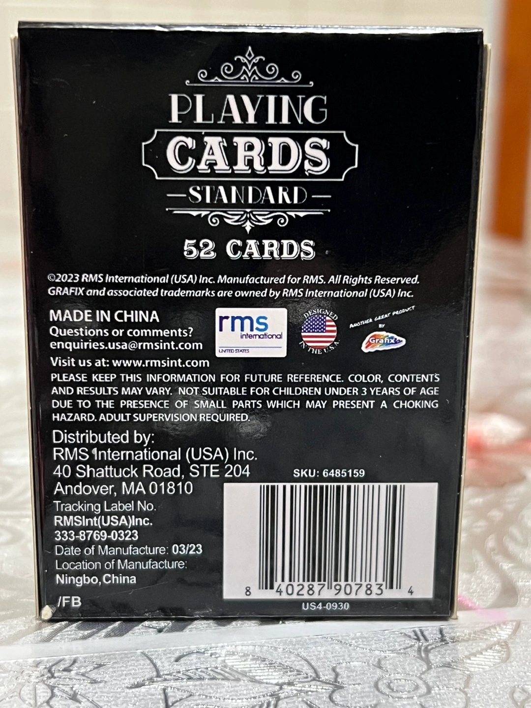 Standard playing cards. 52 cards in a box. Adult supervision required for children under 3. Made in China.
