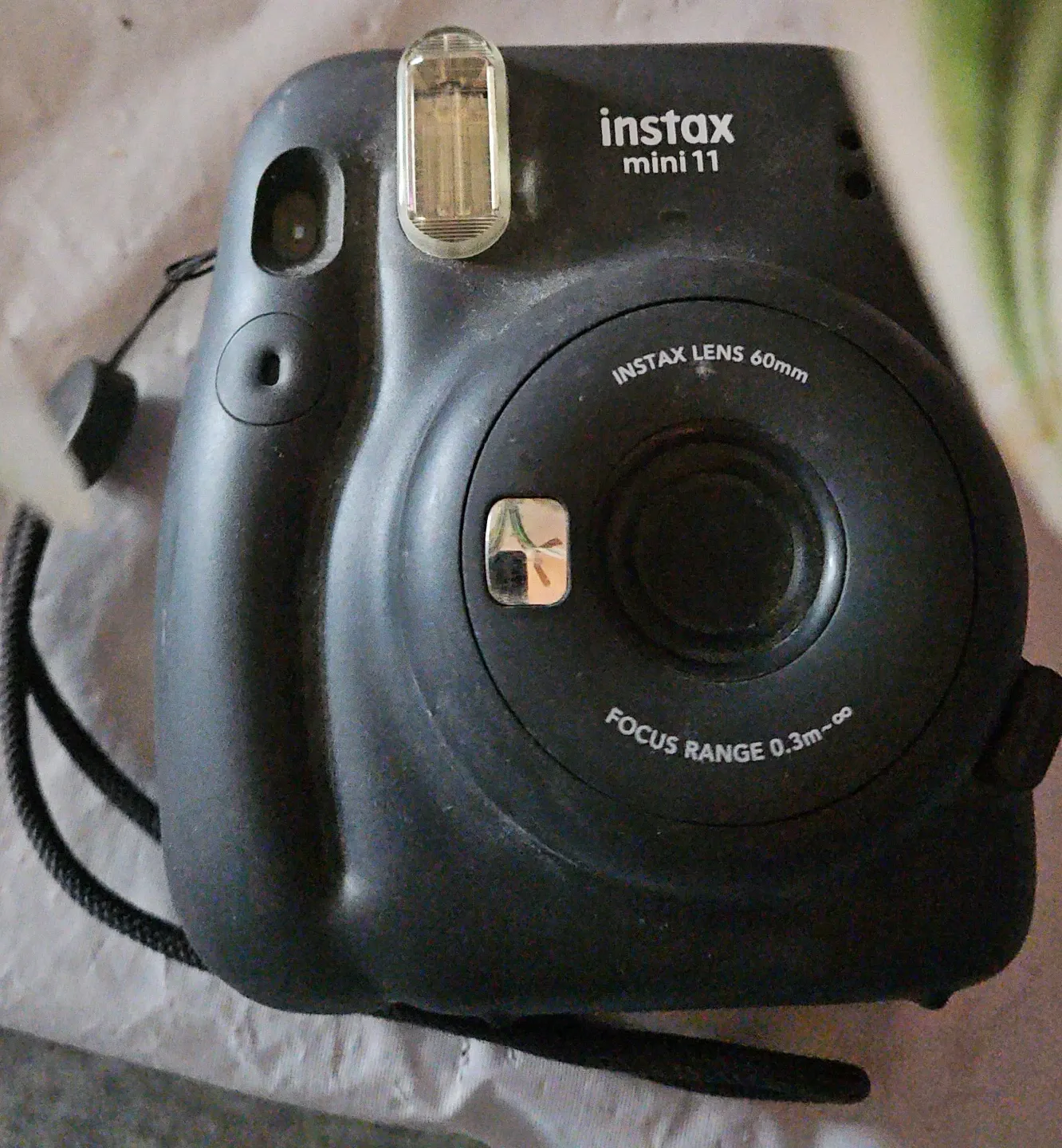 Fujifilm Instax Mini 11 instant camera. Includes the camera and a wrist strap. This camera has a 60mm Instax lens and a focus range of 0.3m to infinity. Cash and pick up only