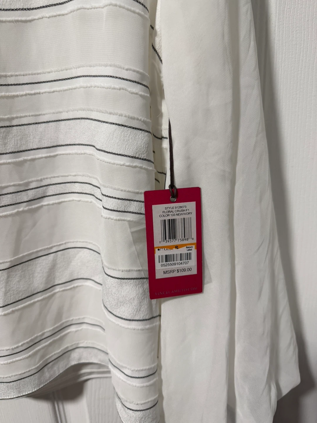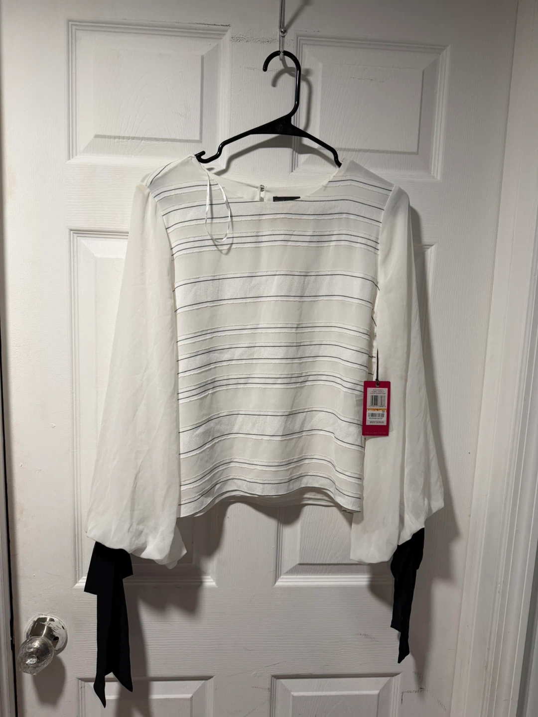 Vince Camuto white blouse with subtle horizontal stripes. It's a size small with long sheer sleeves and black tie accents at the cuffs. Made in China.