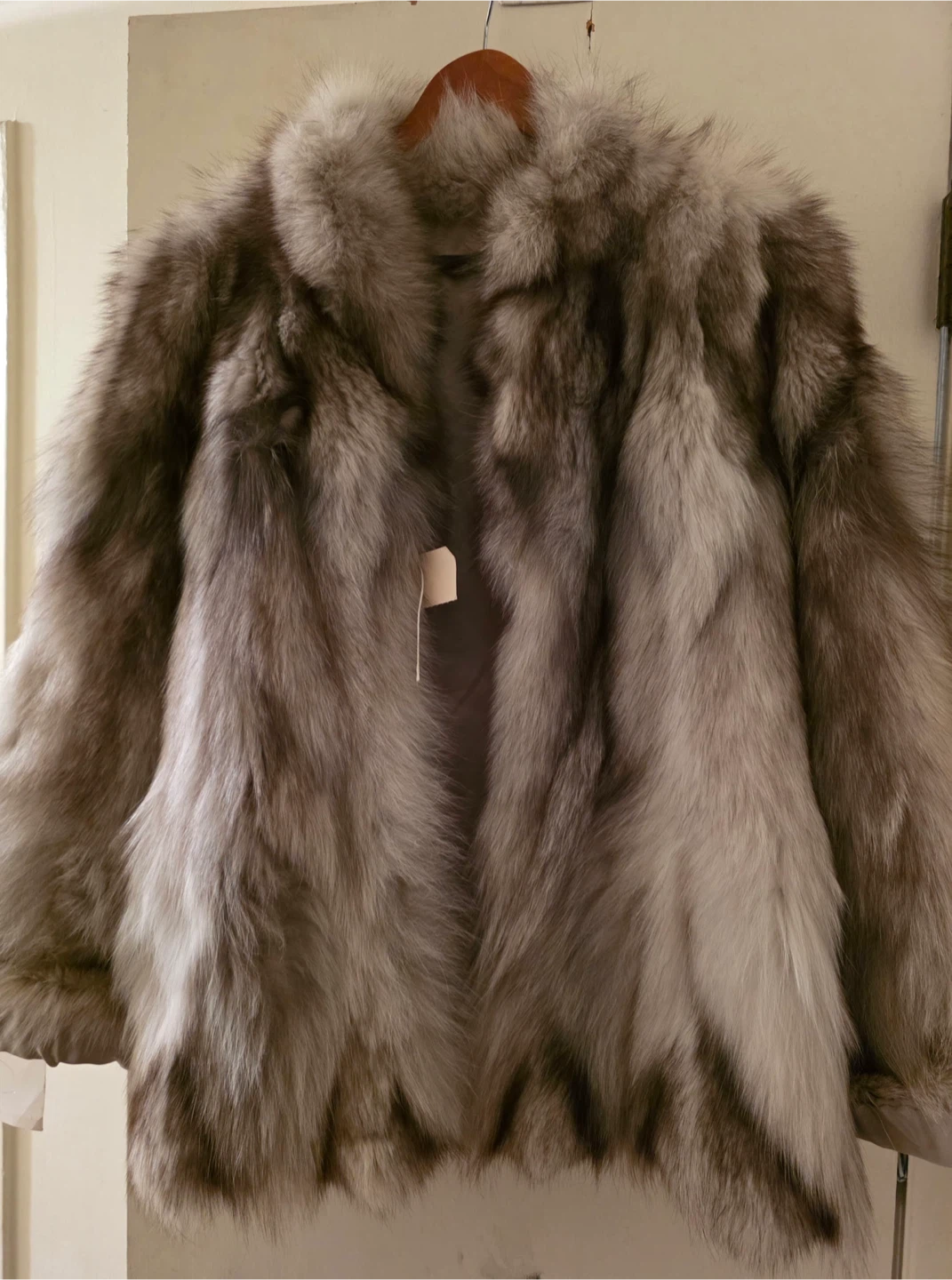 Beautiful silver fox fur coat. Lined with satin. It's a classic style that offers warmth and elegance. Who wouldn't love this luxurious piece?