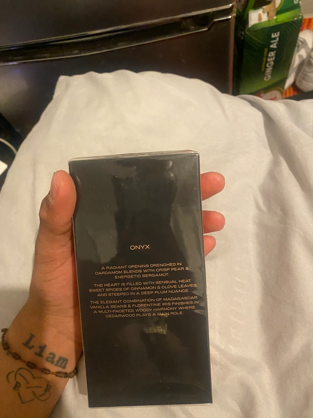 This is the Onyx fragrance by Royalty by Maluma. It's an Eau de Parfum for Kings. The bottle size is 75ml or 2.5 fl. oz. The scent has a radiant opening with cardamom, fresh pear, and Sichuan bergamot. Its heart is filled with sensual floral notes of jasmine leaves, and it's steeped in a deep plum nuance.