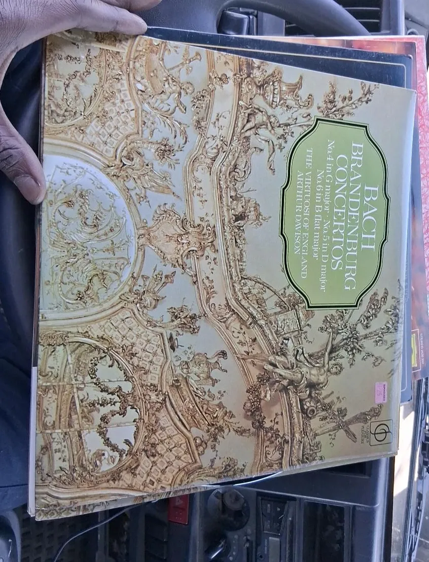 Bach Brandenburg Concertos featuring The Virtuosi of England and Arthur Davison. Includes Concertos No. 4 in G major, No. 5 in D major, and No. 6 in B flat major. This is a classic vinyl record for music enthusiasts.