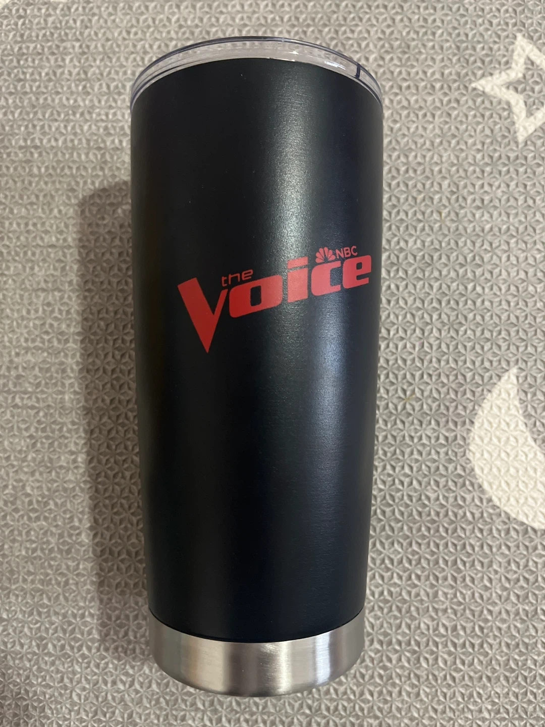Black travel tumbler featuring 'The Voice' and NBC logos. Includes a clear lid with a slider. Keeps drinks hot or cold.