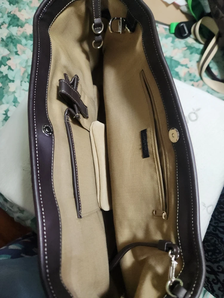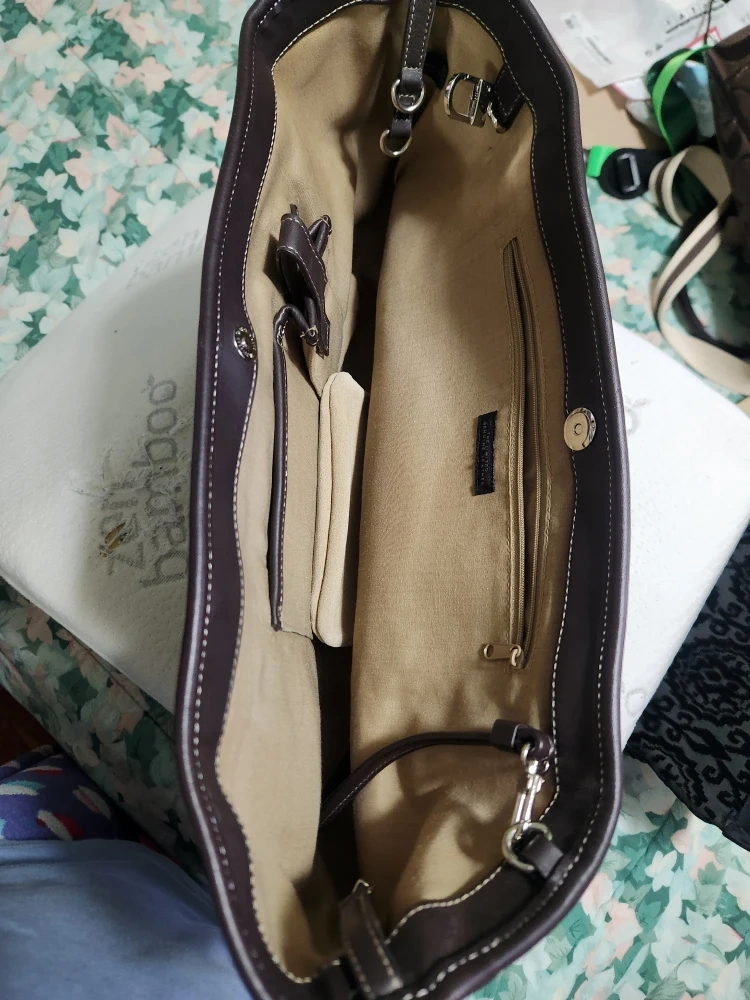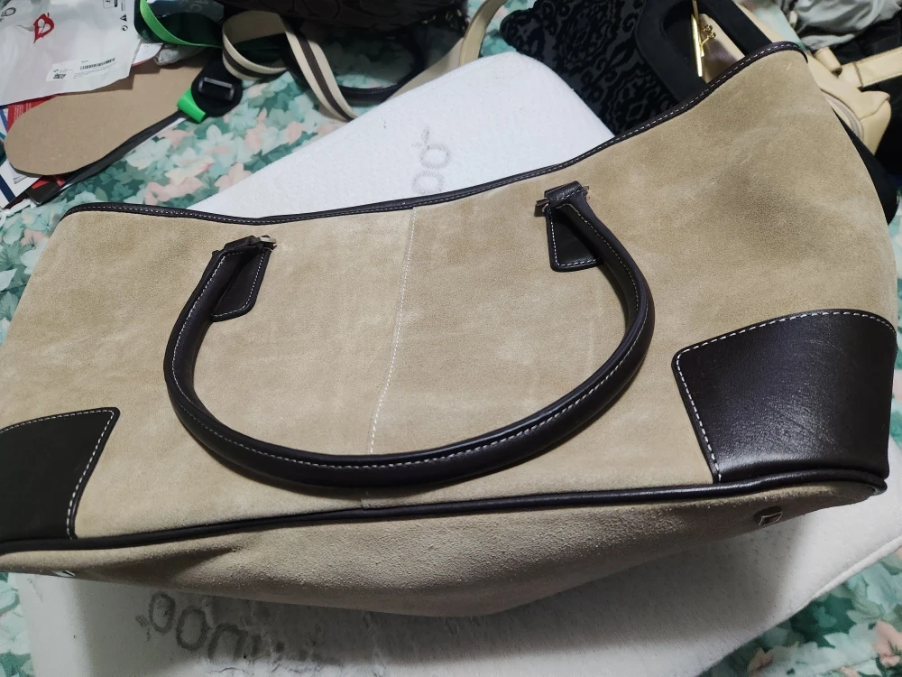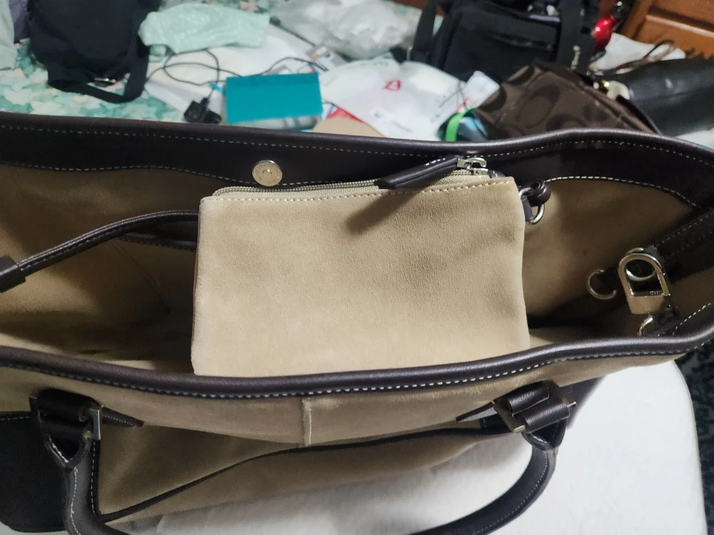 This is a Coach tote bag made of suede and leather. It's in good condition and has a neutral color that would match any outfit! It's a great bag for carrying your everyday essentials