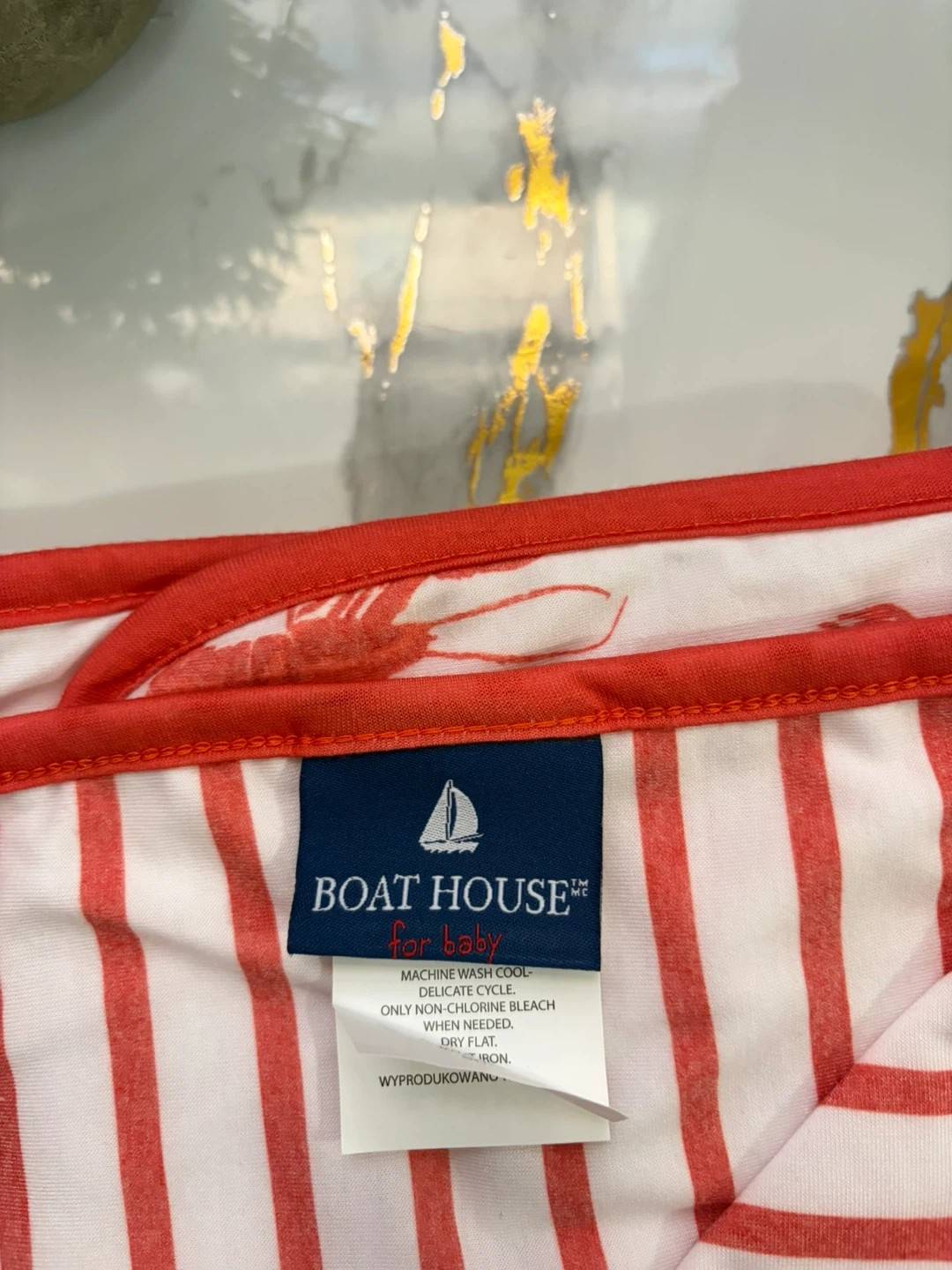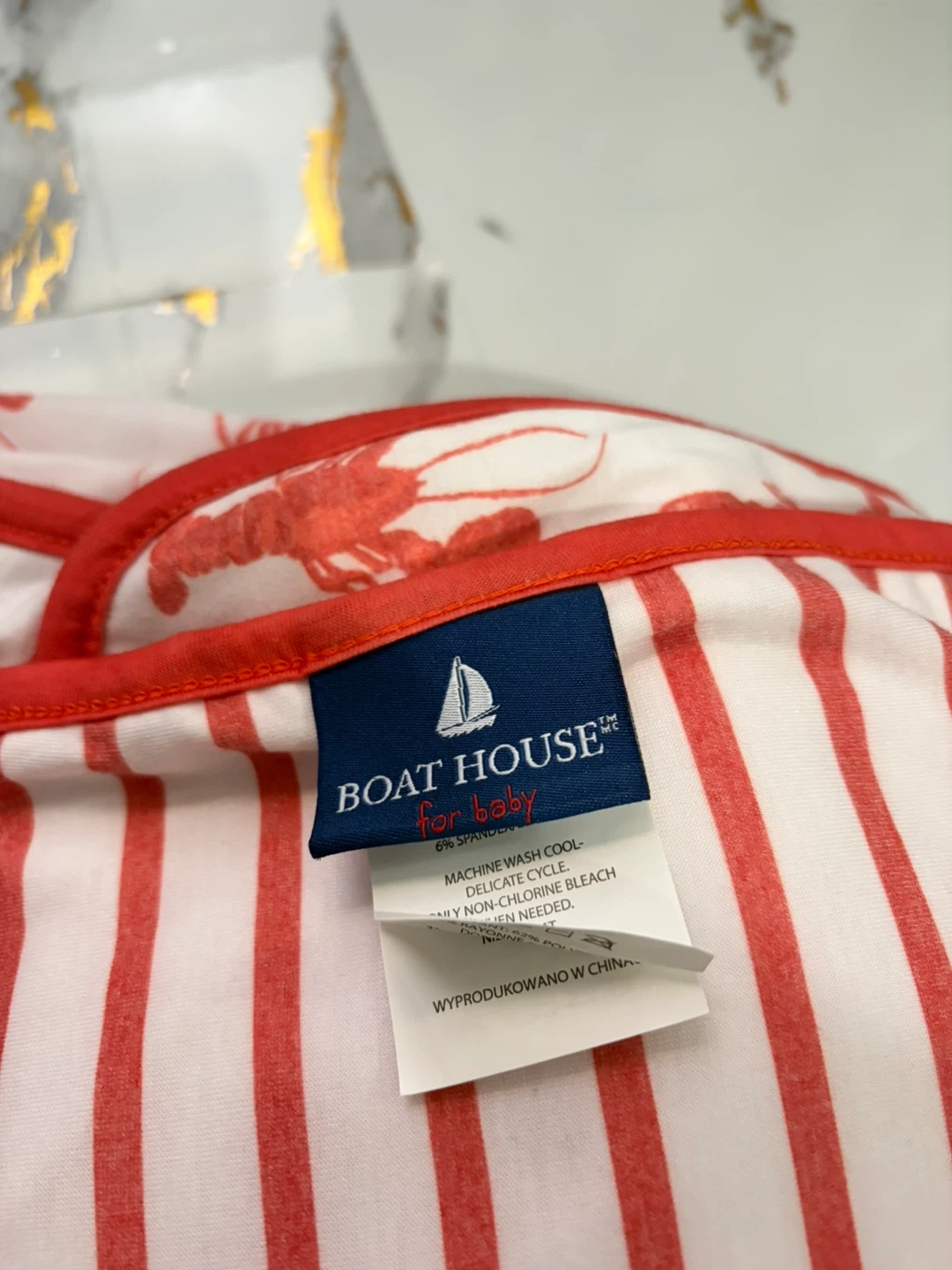 This Boat House for Baby swaddle blanket features a fun lobster print with red and white stripes. Made from a soft, stretchy blend, it's perfect for keeping little ones cozy. Measures approximately 40x40 inches.