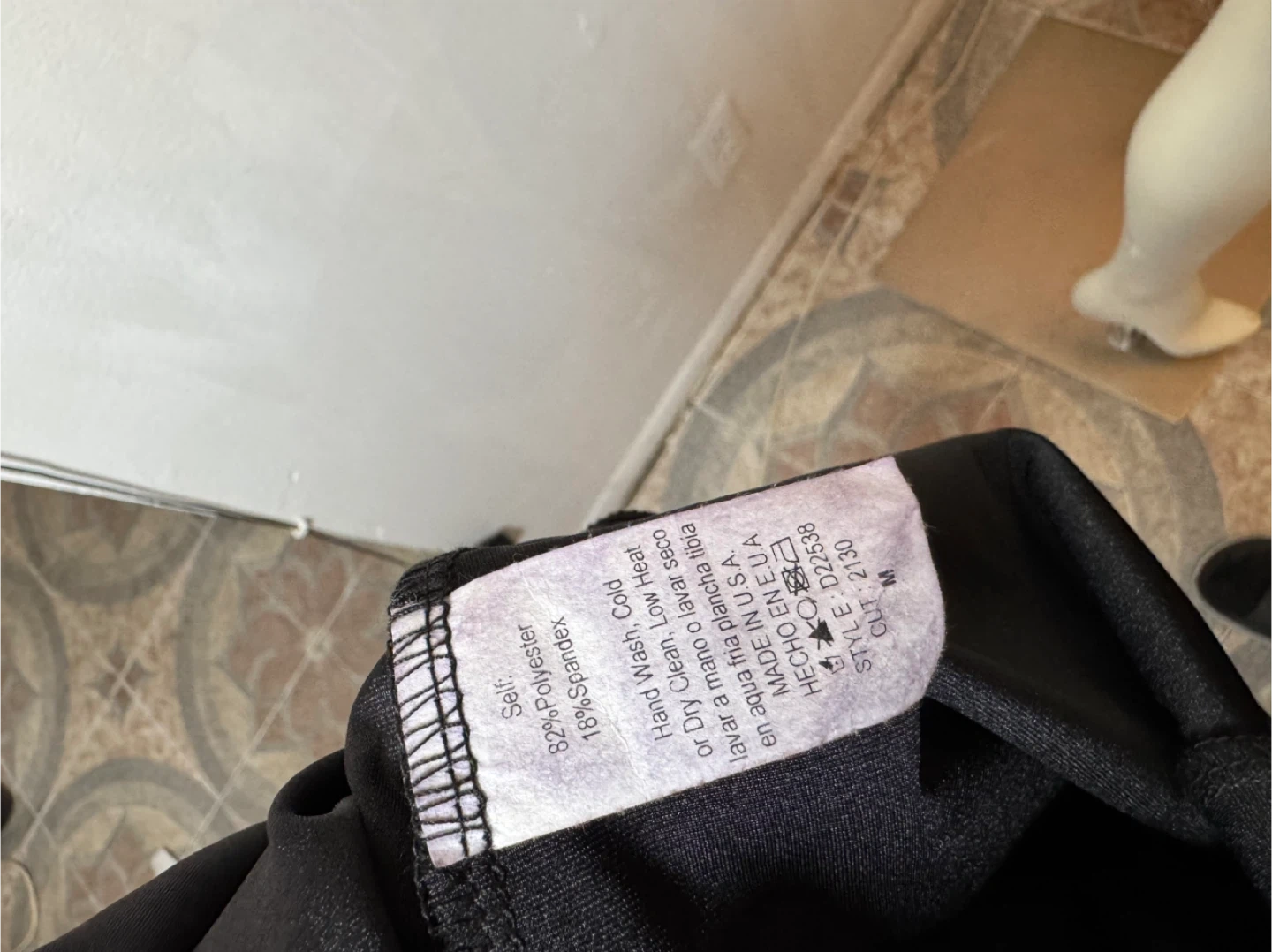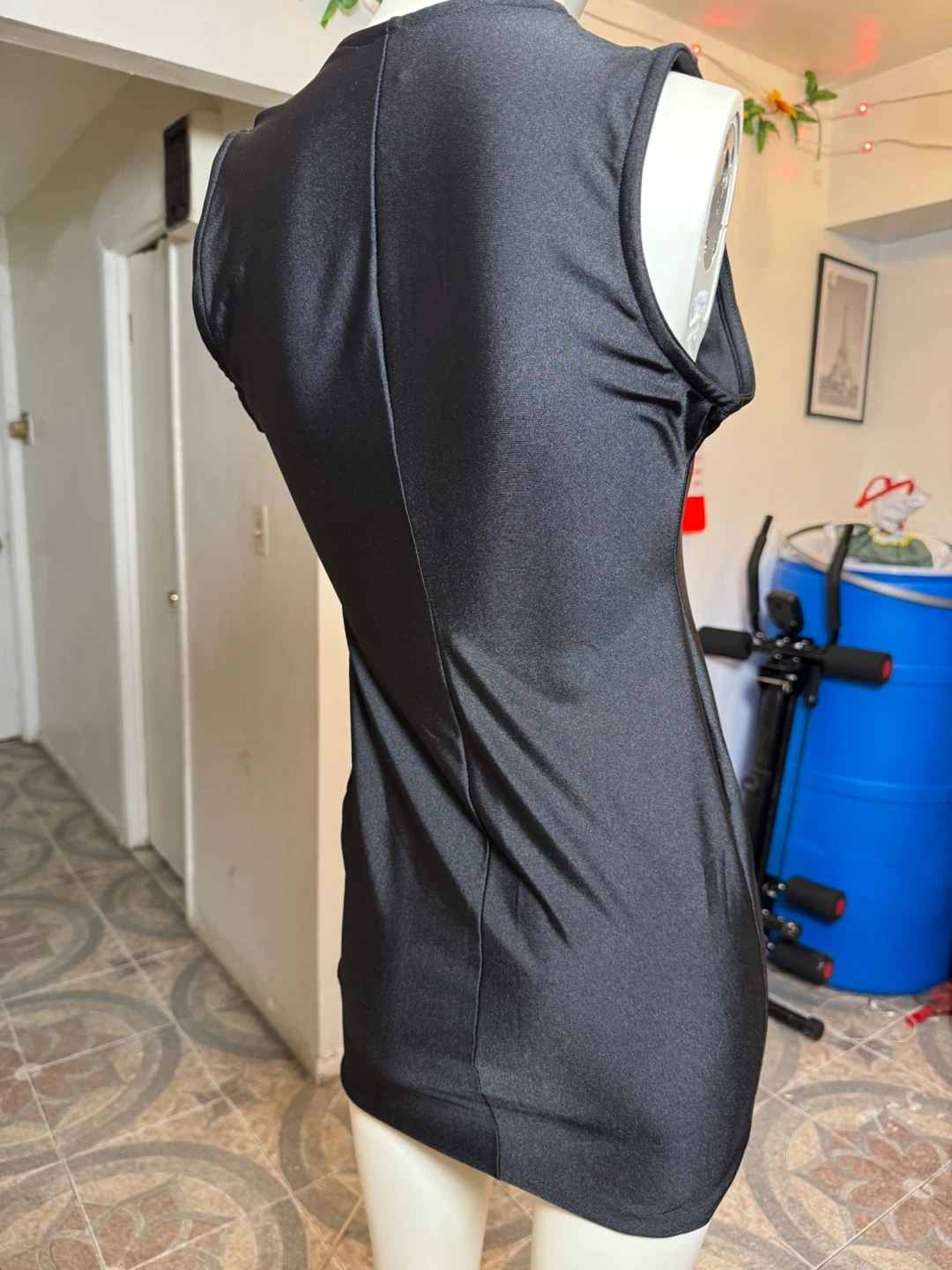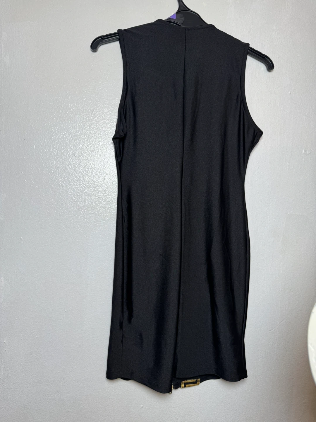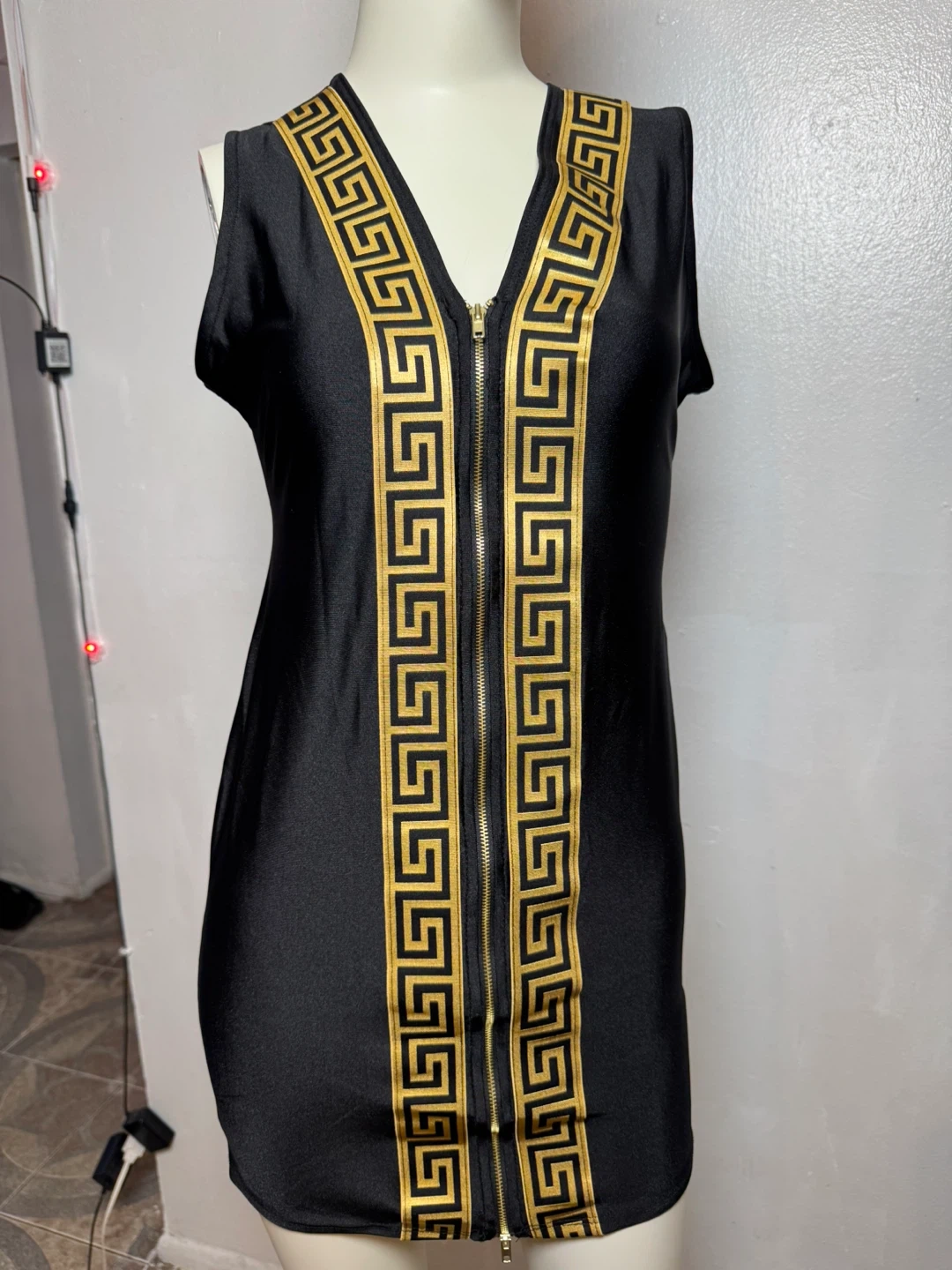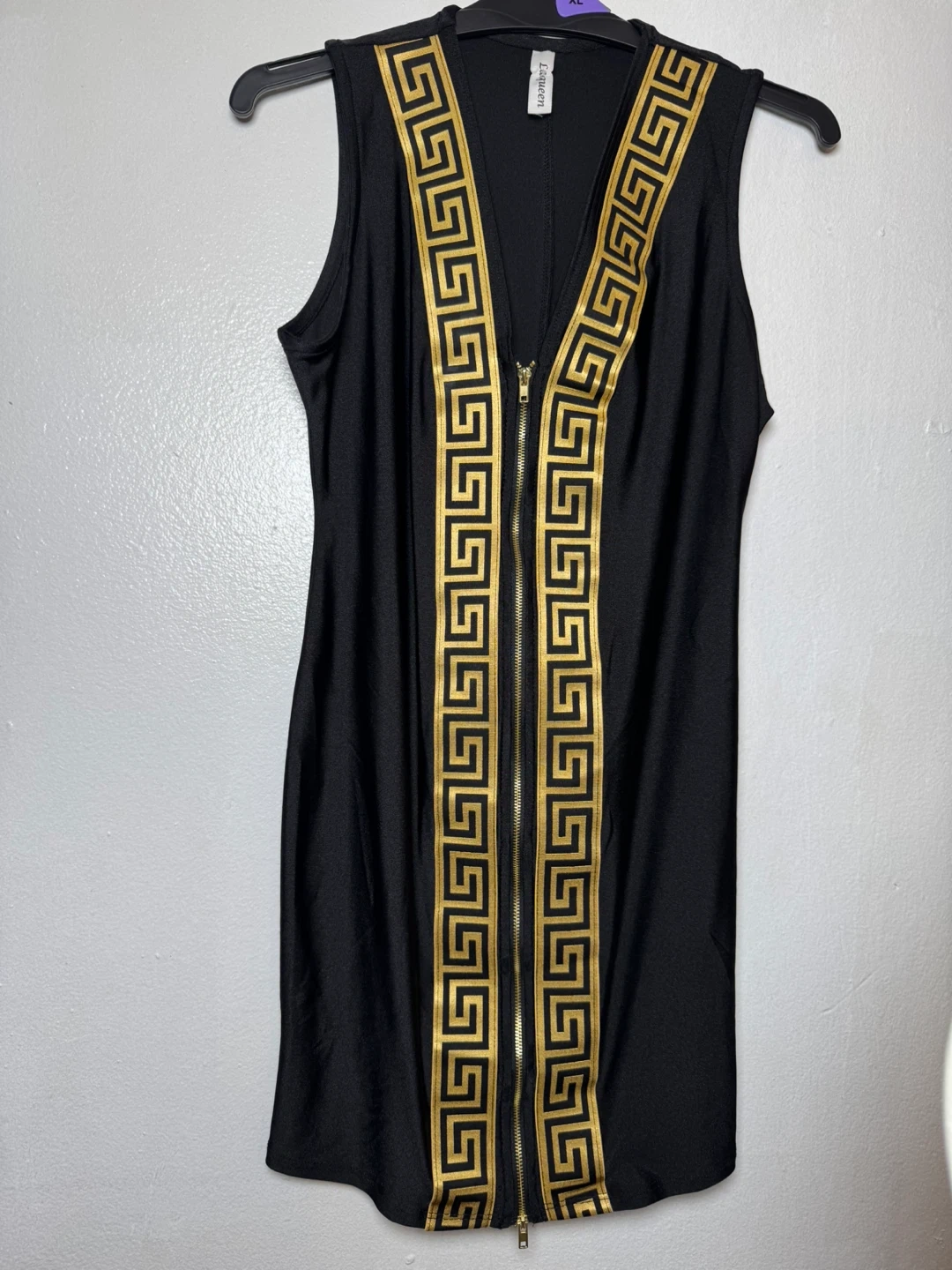 This black sleeveless dress features a gold Greek key pattern down the front zipper. It's made from a blend of 82% polyester and 18% spandex. The dress is size medium. Hand wash cold recommended.