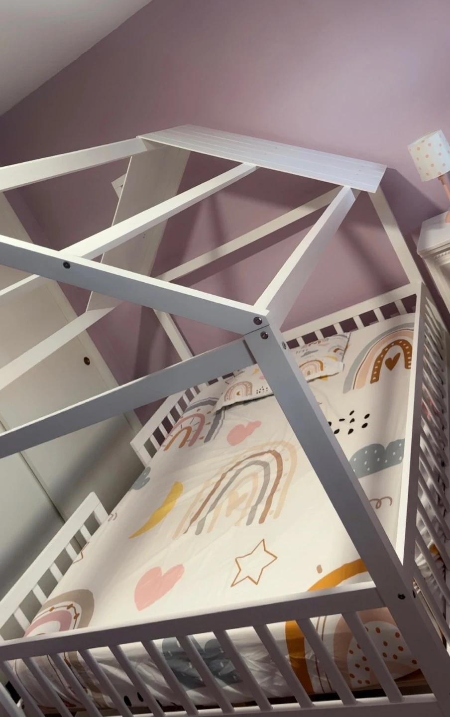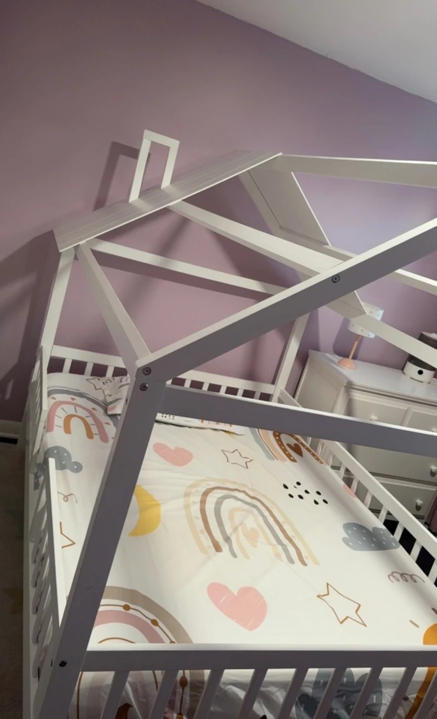 Cute house-shaped twin bed frame in white. It's perfect for a child's bedroom and comes with adorable rainbow-themed bedding. The frame is made of wood and includes safety rails.
