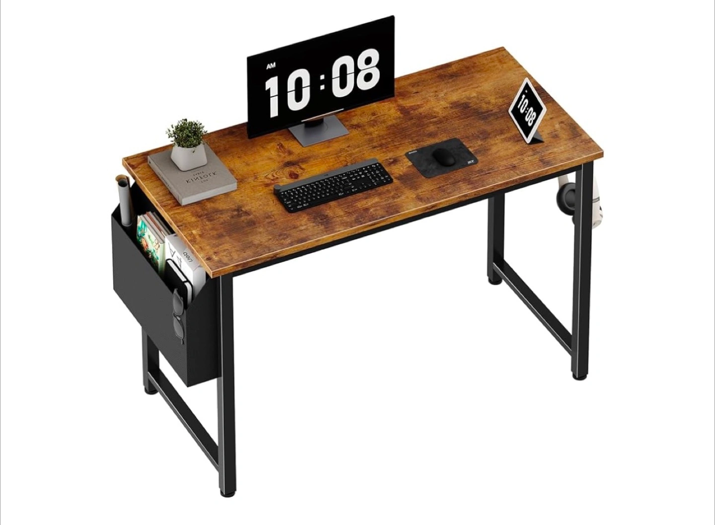Selling a rustic brown desk! It features a convenient storage pocket on the side, perfect for keeping your workspace tidy.