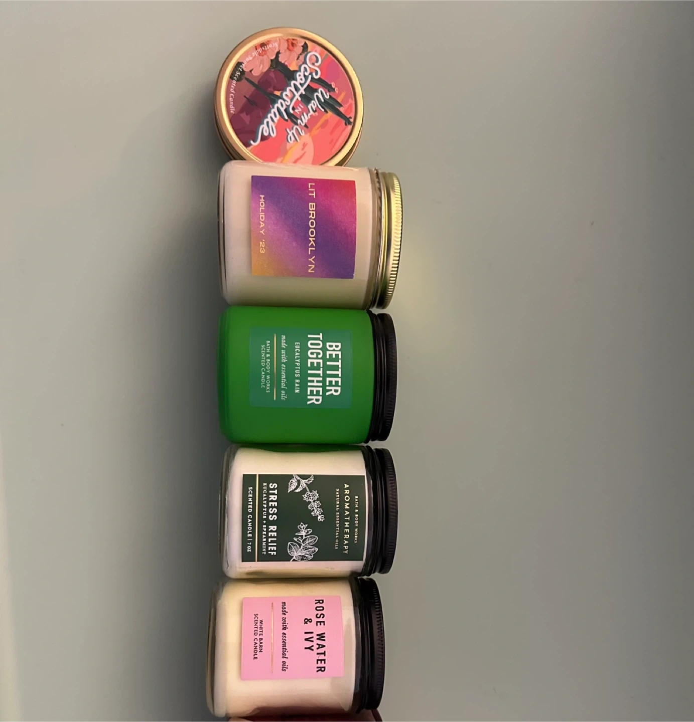 Selling a variety of scented candles! There's a Warm Up Scottsdale pet scented candle, a Lit Brooklyn Holiday '23 candle, a Better Together eucalyptus rain candle, a Stress Relief eucalyptus and spearmint candle, and a Rose Water & Ivy candle from White Barn. All are scented candles!