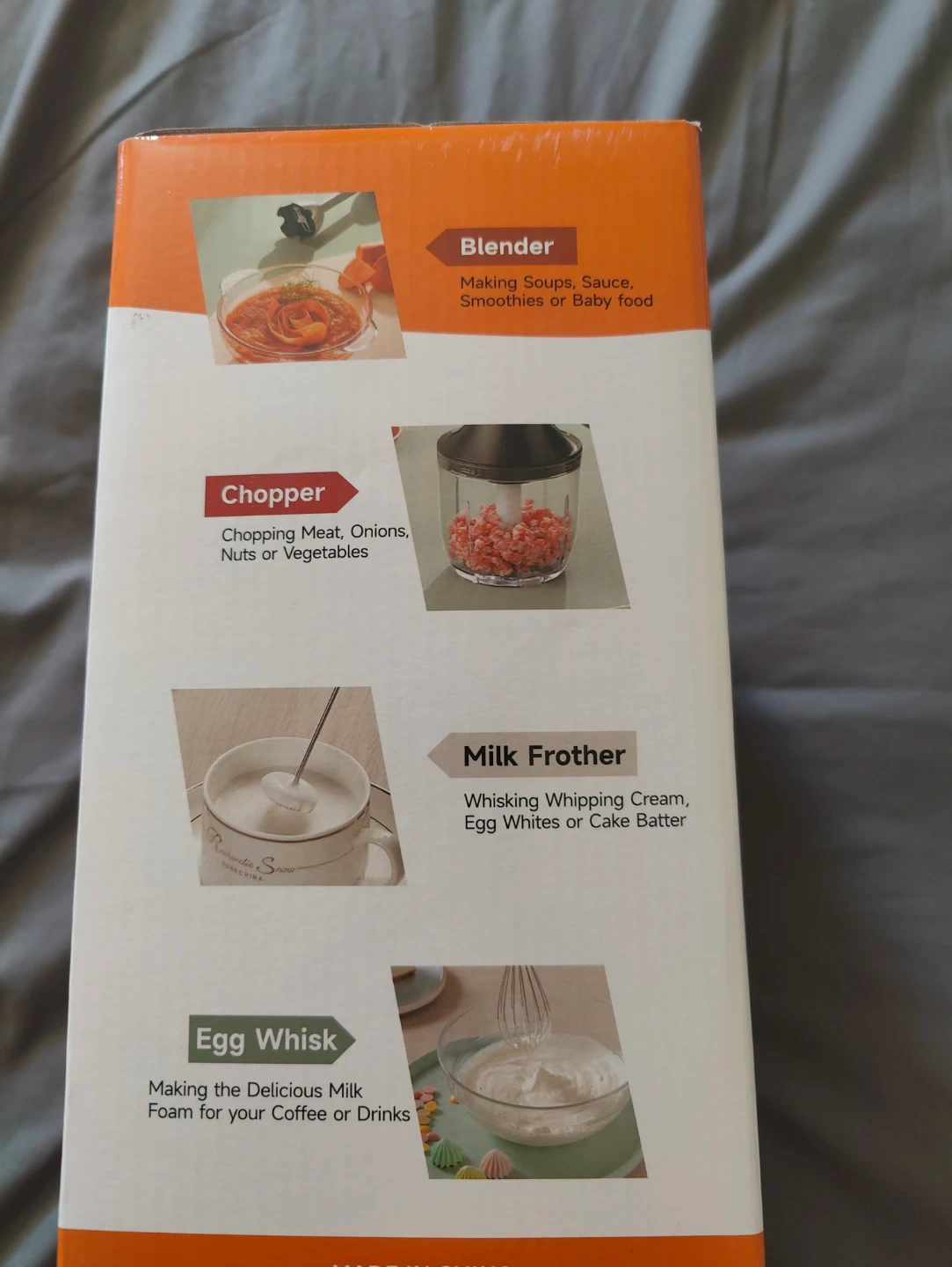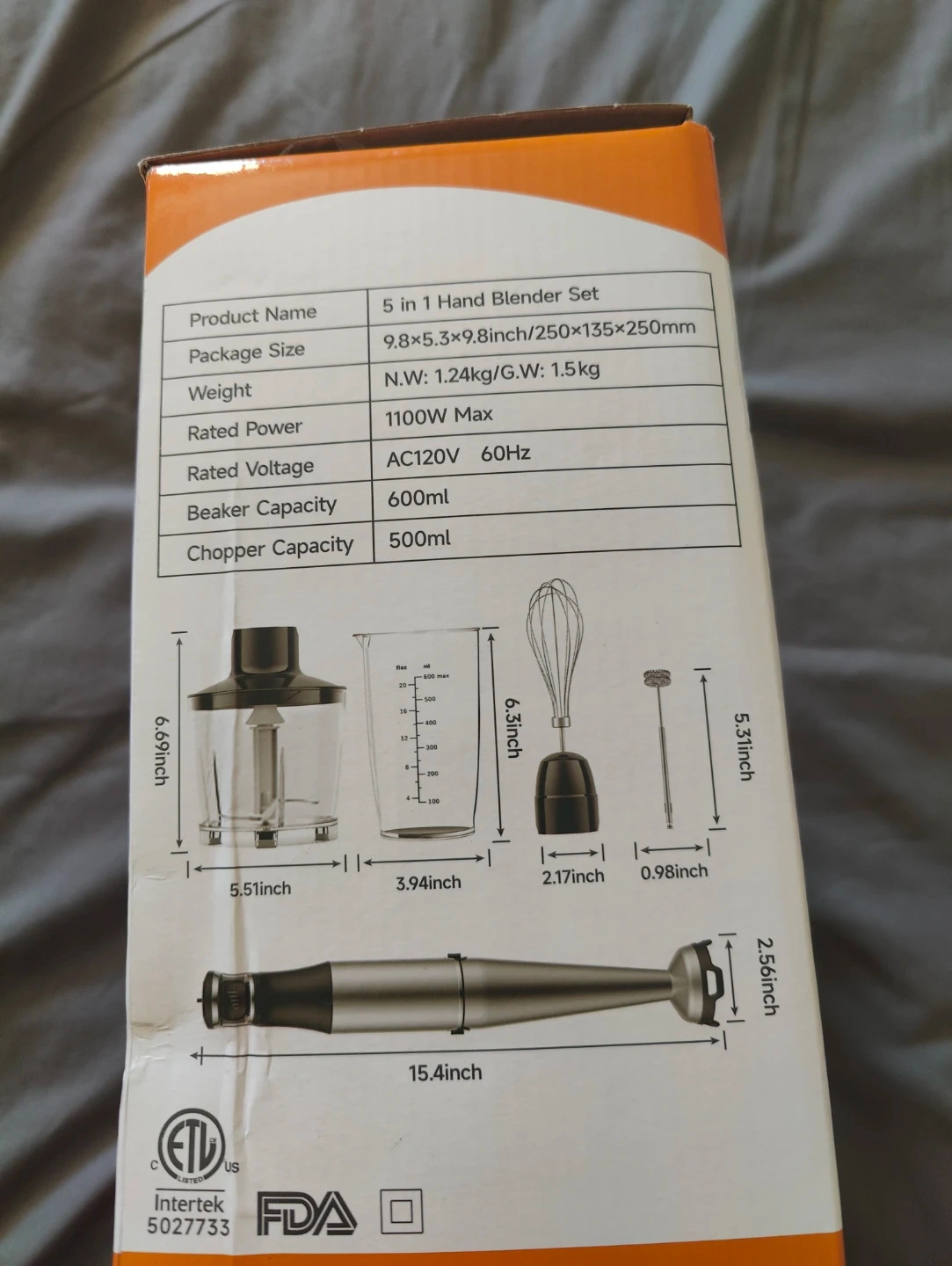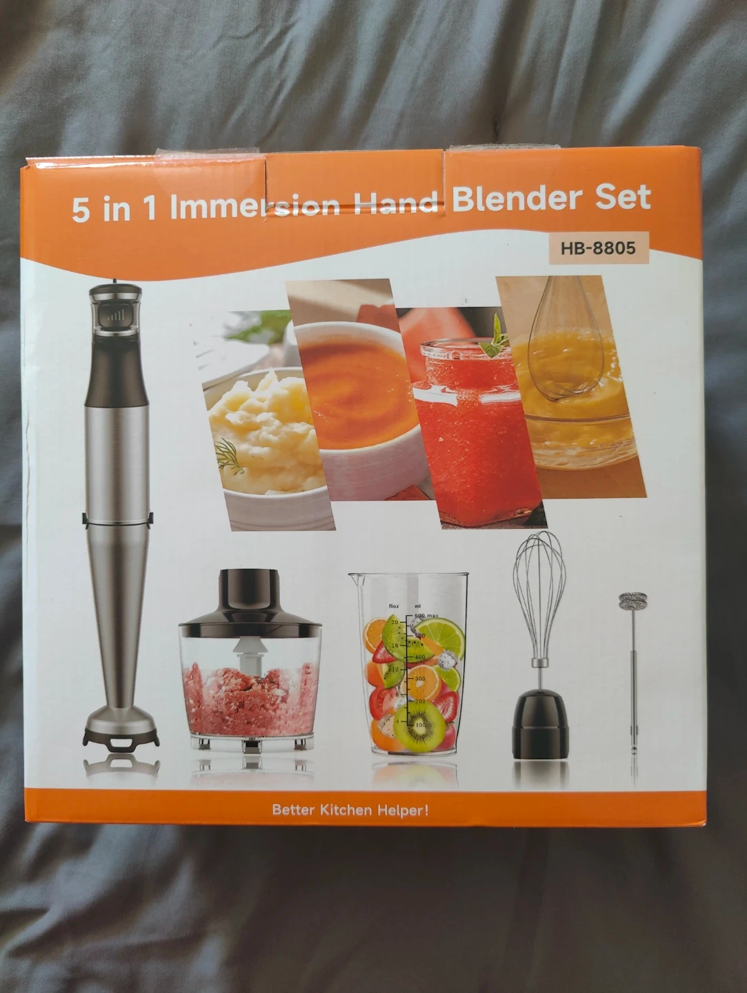 This 5 in 1 hand blender set includes a blender, chopper, milk frother, and egg whisk. It has a 1100W max power and comes with a 600ml beaker and a chopper capacity of 500ml. It's great for making soups, sauces, smoothies, or baby food.