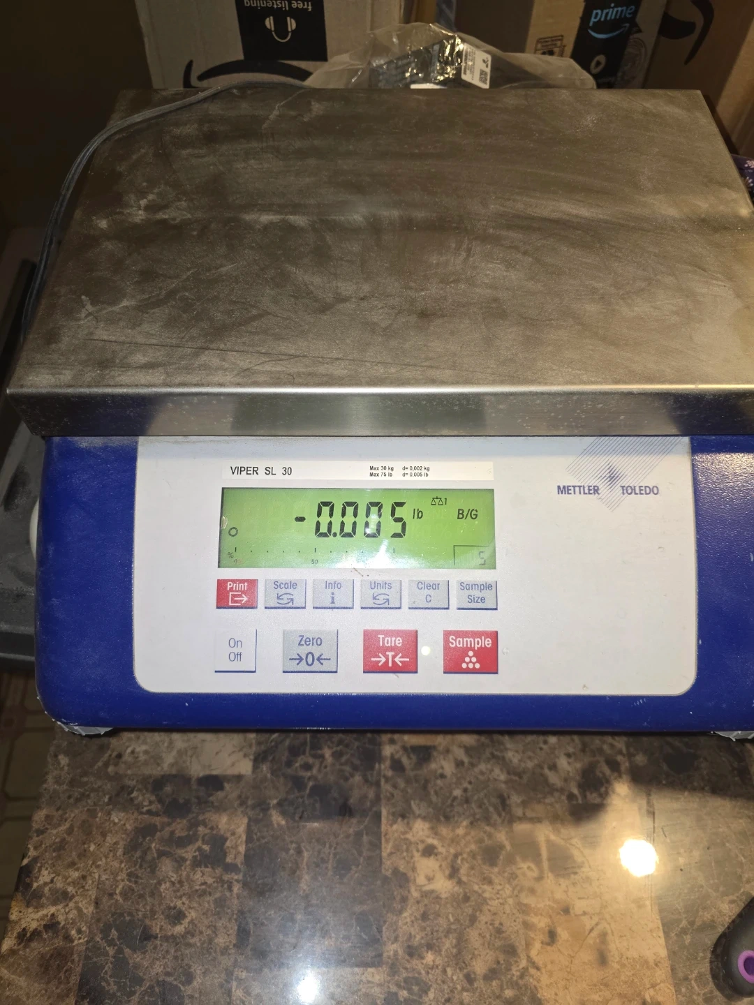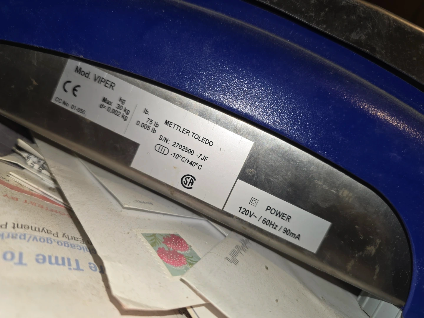 This Mettler Toledo Viper SL 30 digital scale has a maximum capacity of 30 kg. It supports measurements in both pounds and kilograms. Power input is 120V~ / 60Hz / 90mA.