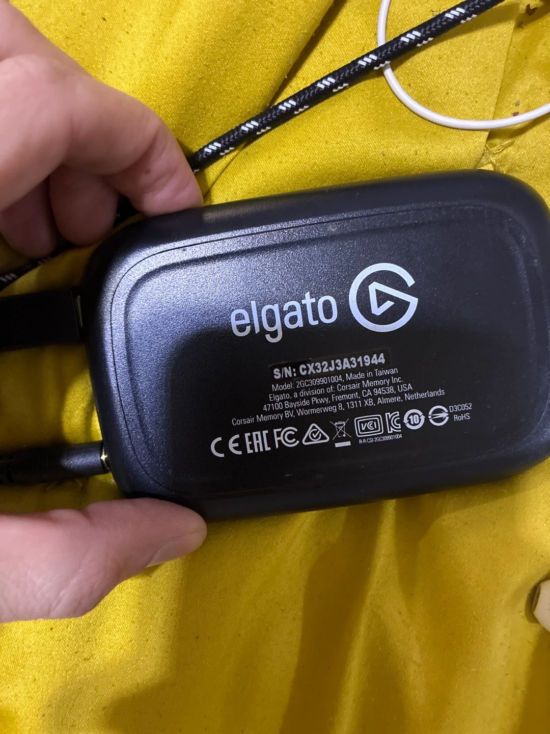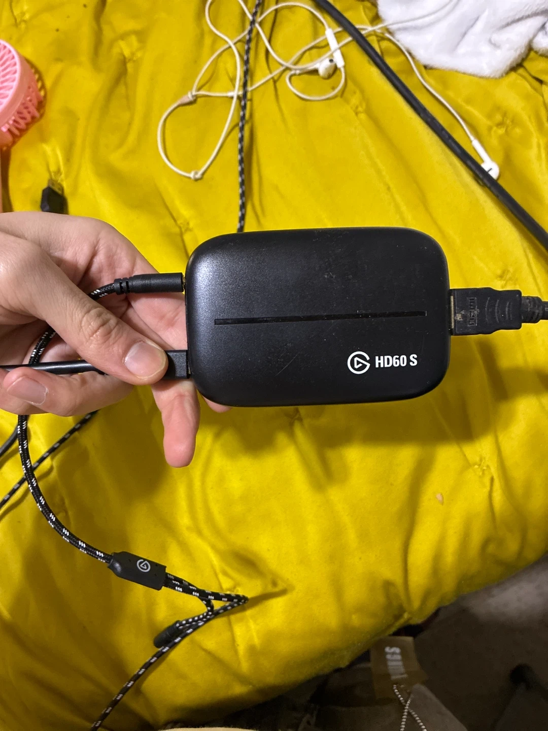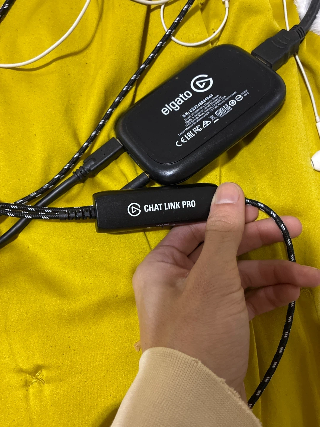 Elgato HD60 S capture card and Chat Link Pro device. It's designed for streaming and recording gameplay. Connects via USB and HDMI for high-quality video capture.