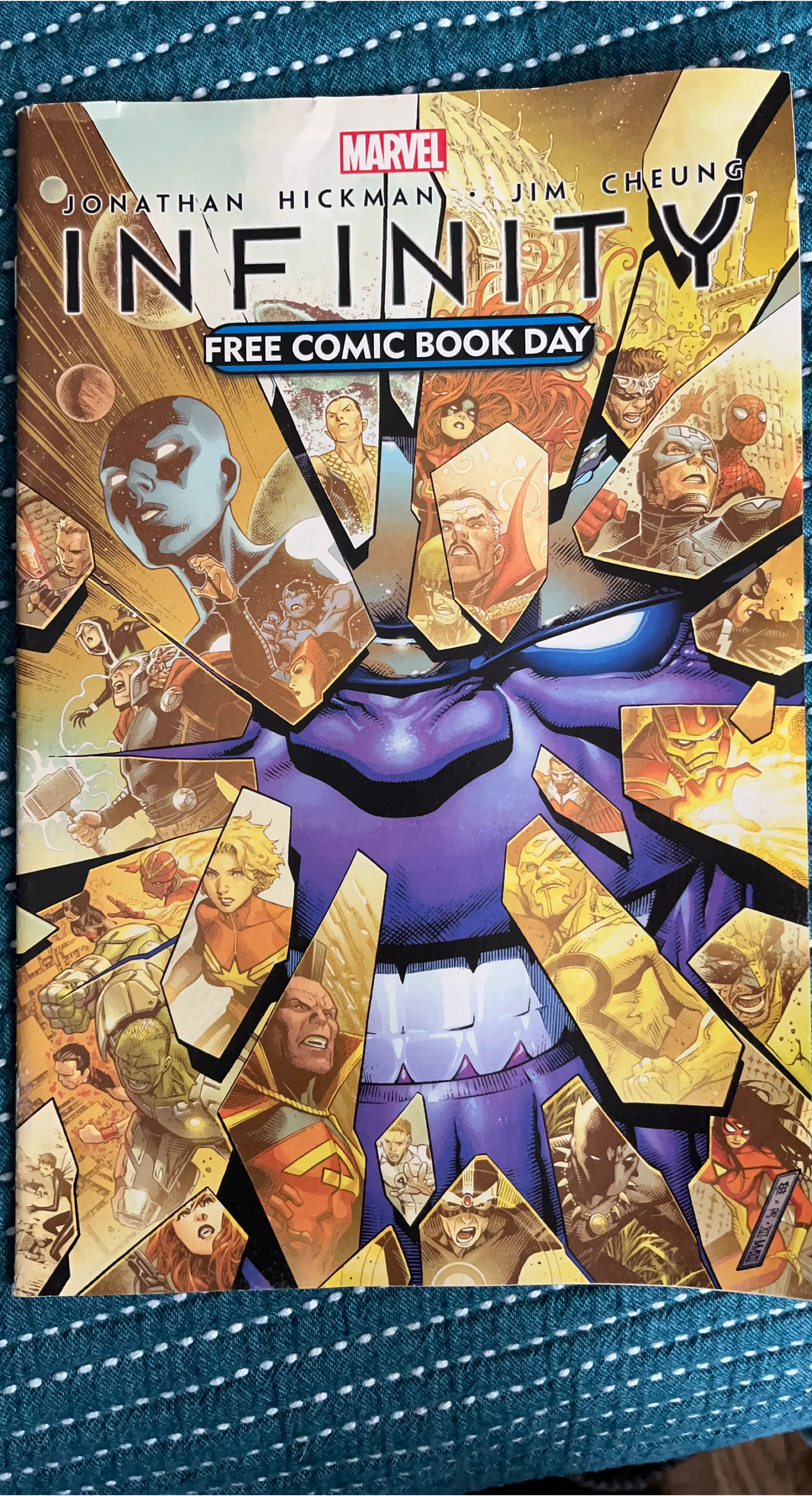 Selling a Marvel Infinity comic book. It's in great condition and features Jonathan Hickman and Jim Cheung! Near mint condition.
