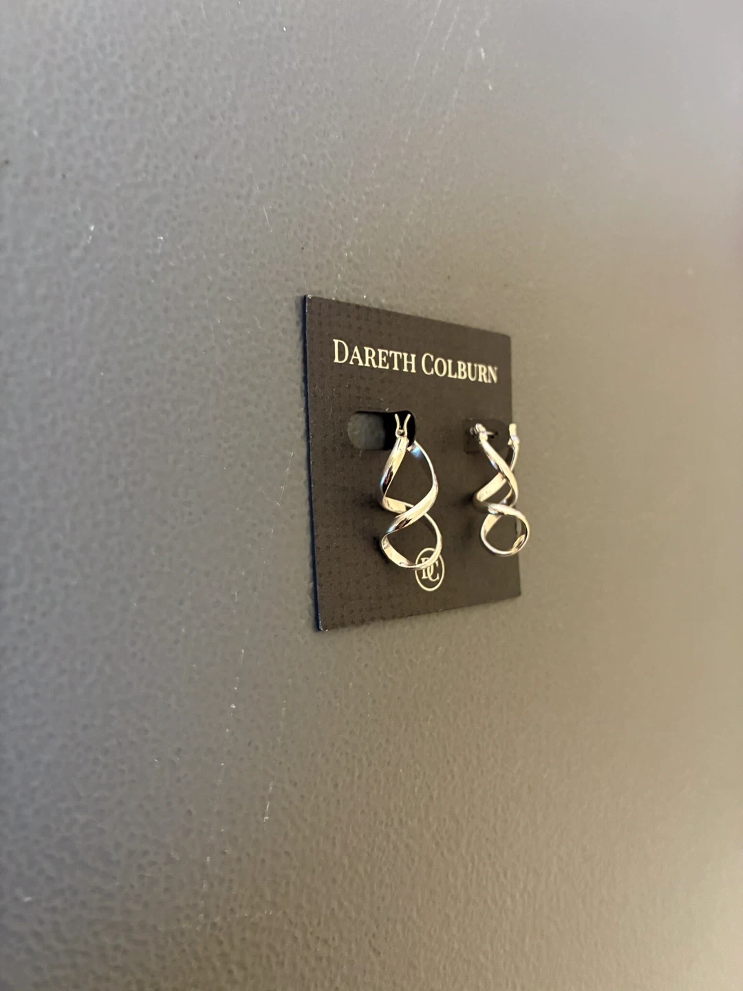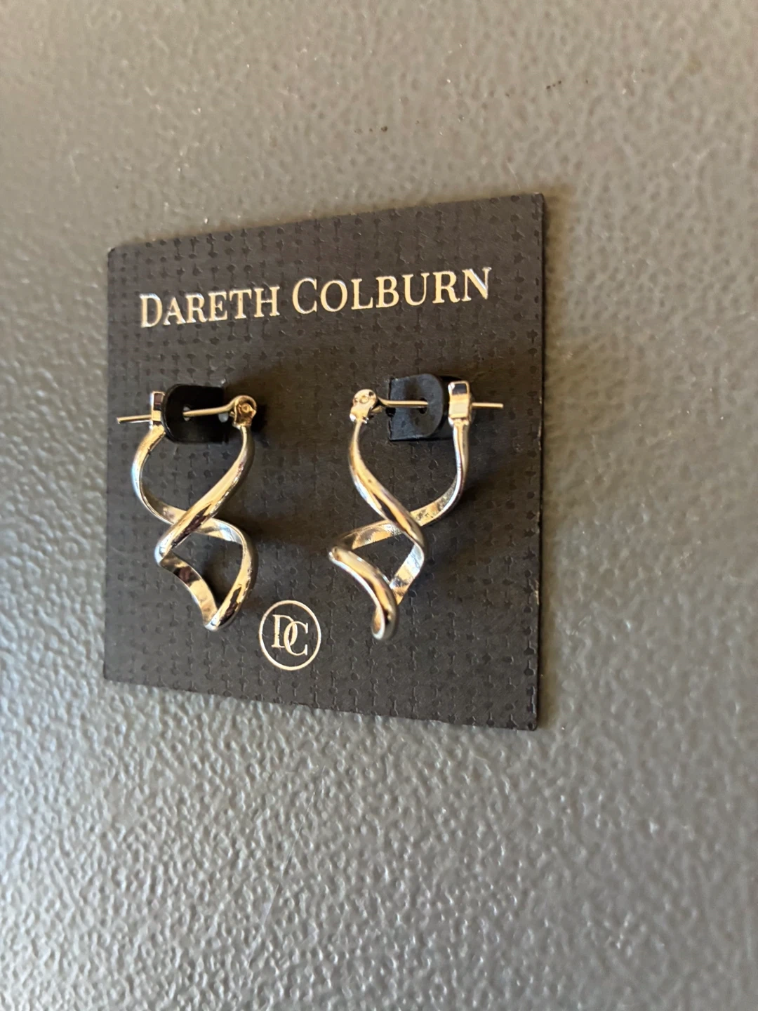 Dareth Colburn earrings with a unique swirl design. Silver tone finish. These hoop earrings add a touch of modern style to any outfit!
