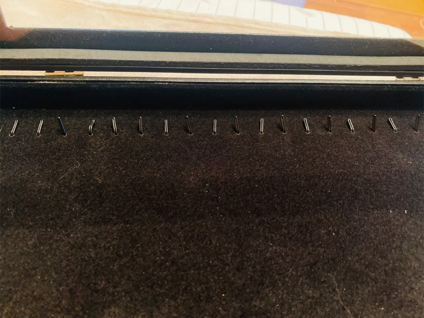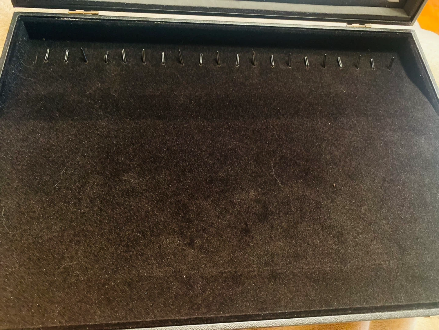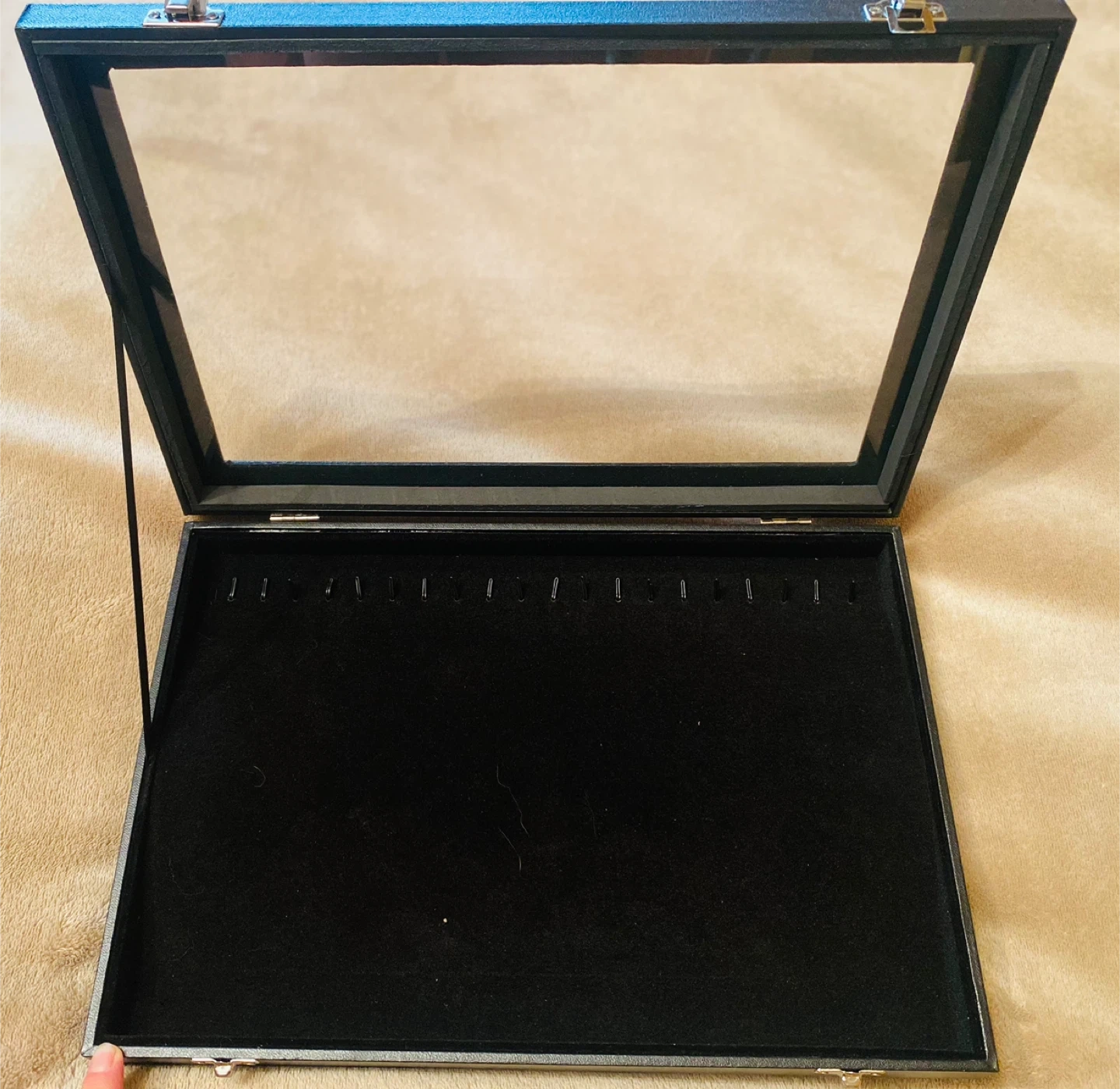 I'm selling a jewelry display case. It's black with a glass top and a soft, black velvet interior. Perfect for organizing and showcasing your favorite pieces!