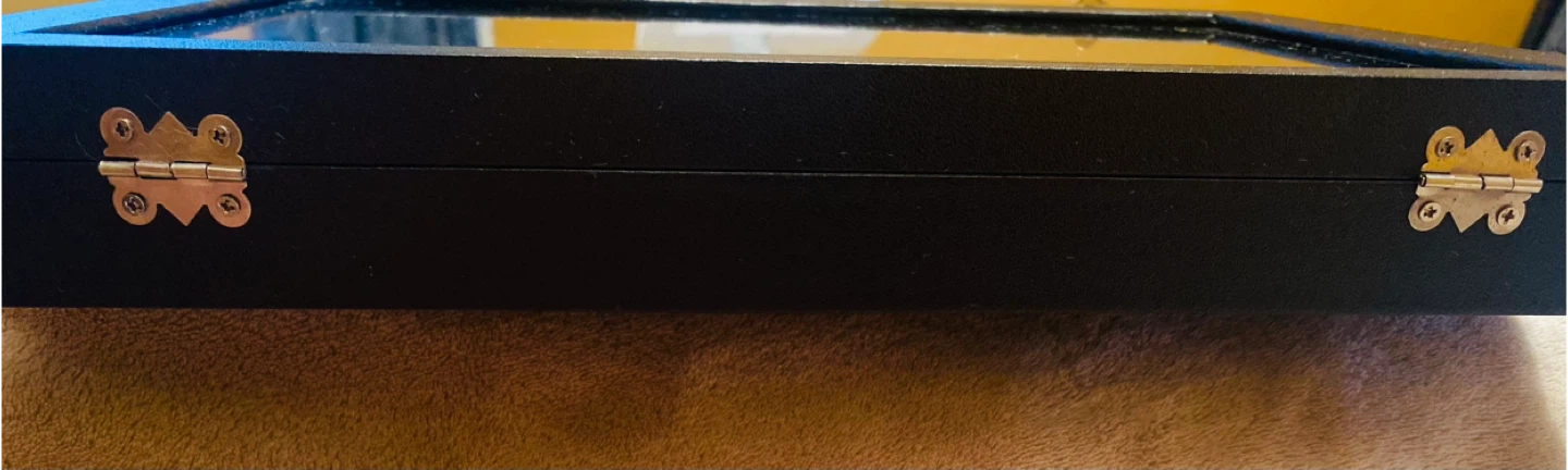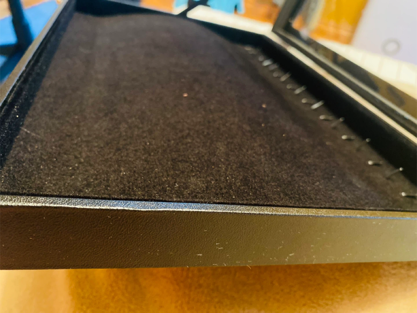 I'm selling a jewelry display case. It's black with a glass top and a soft, black velvet interior. Perfect for organizing and showcasing your favorite pieces!