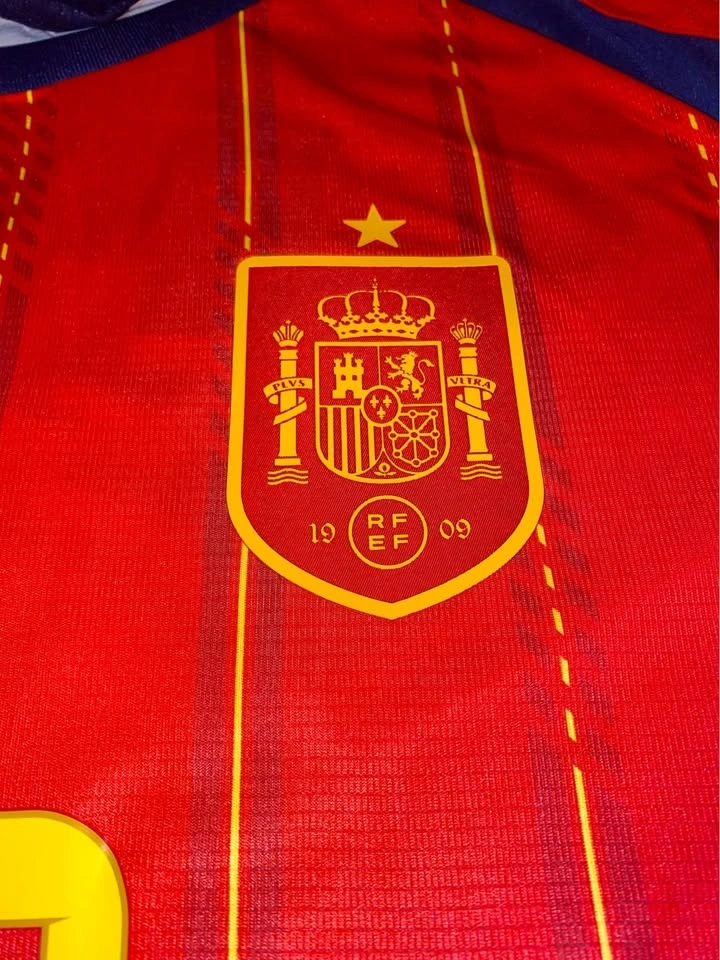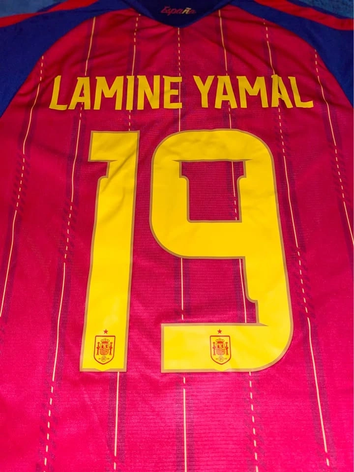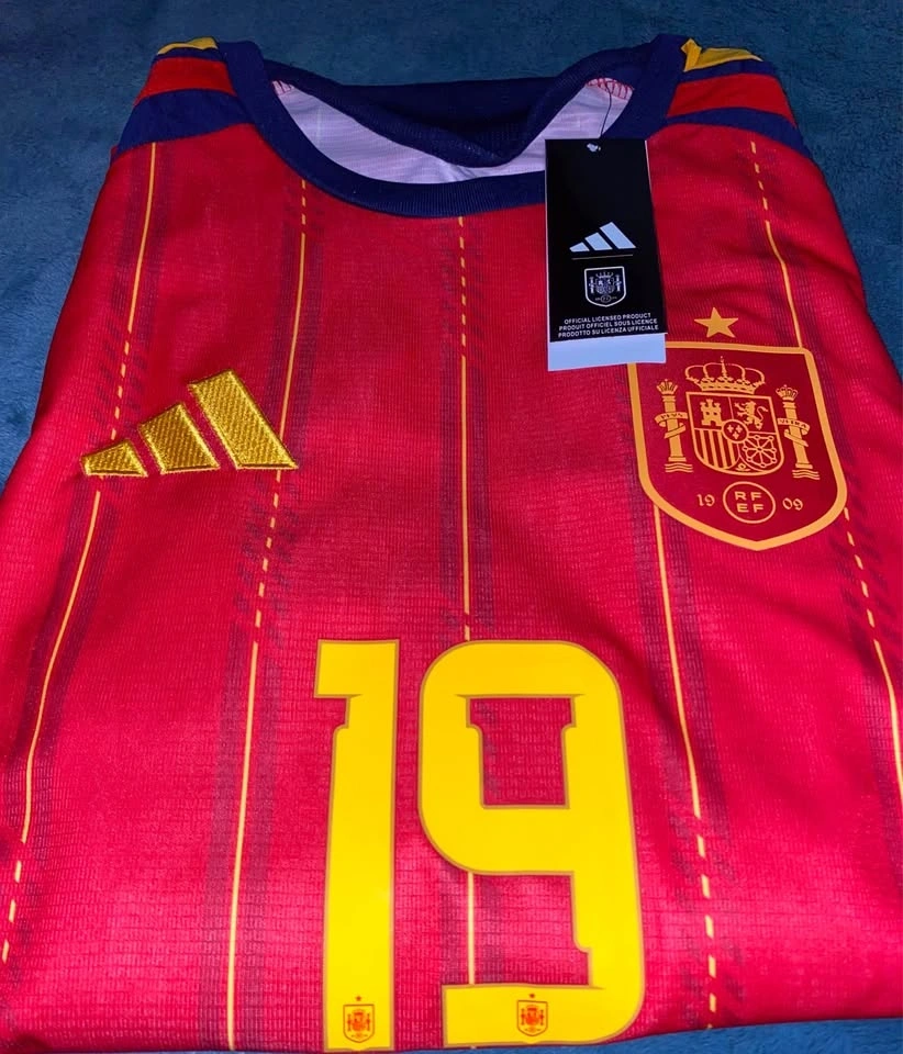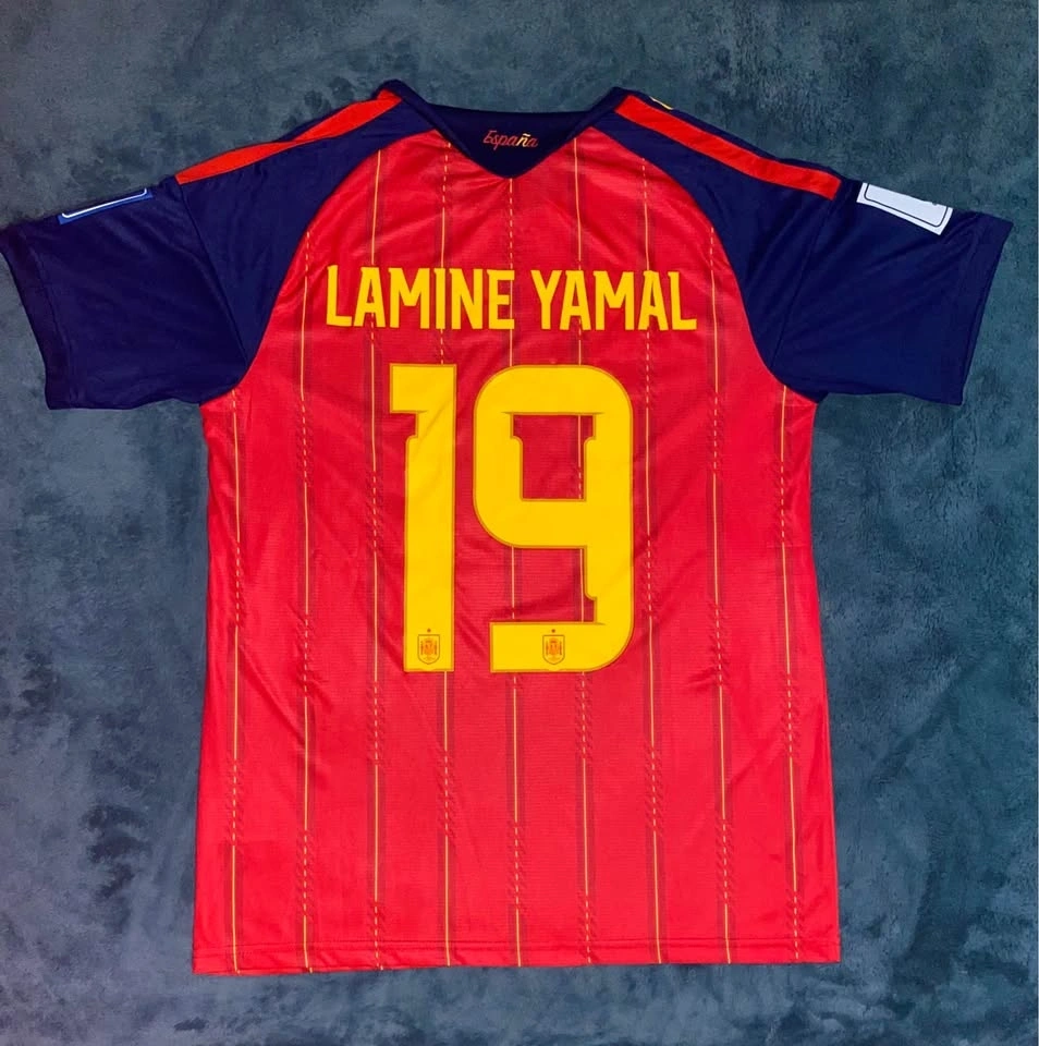 The product is a 2026 World Cup national team jersey for Spain, featuring patches of player Lamine Yamal. Made by adidas, this medium-sized soccer jersey is designed in a multi-color scheme, representing the Spanish national team. A must-have for fans of Spanish soccer, this jersey combines style and support for the team.